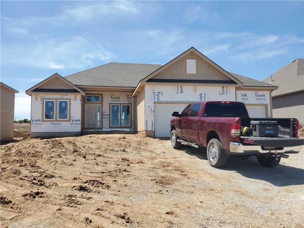 Introducing "The Jordan" - a brand new and beautifully designed Ranch/Reverse 1.5 Story floorplan by Hoffmann Custom Homes that was created from the ever popular, Taylor plan. This spacious home offers a luxury kitchen with gas cooktop, built in microwave and oven, 3 bedrooms and 2 bathrooms on the main floor, featuring soaring ceilings that create an open and airy ambiance. Convenience is at the heart of this layout with features that include laundry on the main level, secondary bedrooms on opposite side of the home from the Primary Suite. Speaking of the Primary Suite, you won't be disappointed! Boasting double vanities, freestanding tub and separate shower. The 2nd and 3rd main floor bedrooms come with walk-in closets and share easy access to a full bathroom, ensuring privacy and comfort for guests. The Jordan also features a finished lower level for relaxation and entertainment. It features a 4th bedroom, a 3rd full bathroom, a spacious rec room, and a stylish wet bar with granite countertops and backsplash - perfect for hosting gatherings or unwinding with family. Upgrades to this particular home include trim package #1, stone fireplace, comfort height elongated toilet stools, whole house humidifier, upgraded front elevation package (C), freezer circuit in garage and the new KCMO Energy Package requirements. Home is under construction. Contact listing agent for status updates.