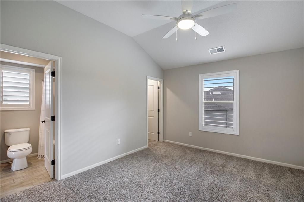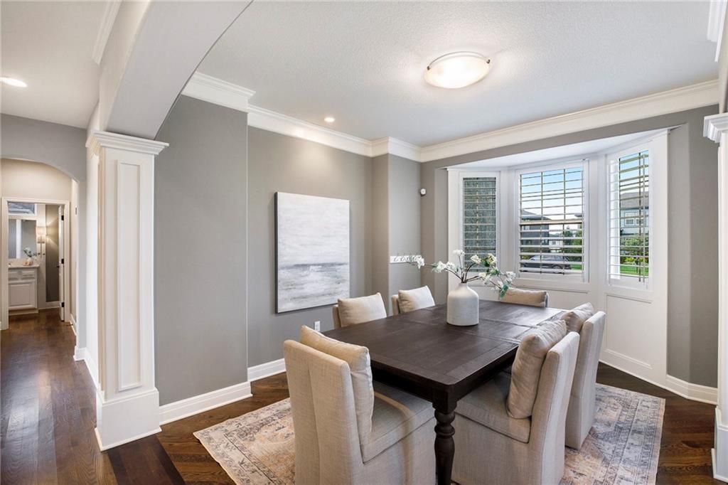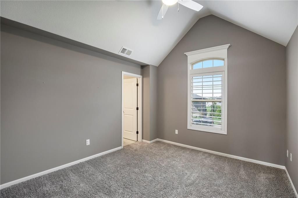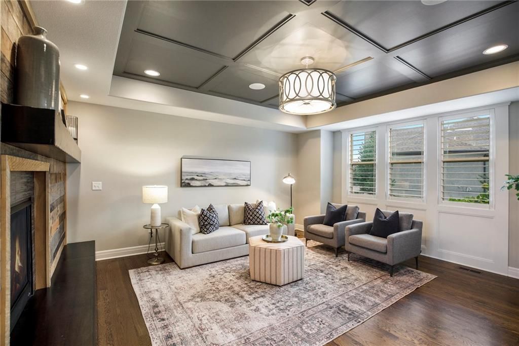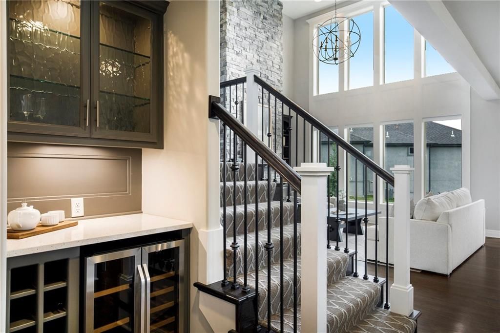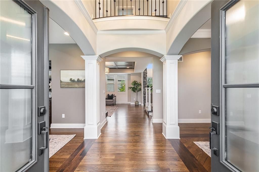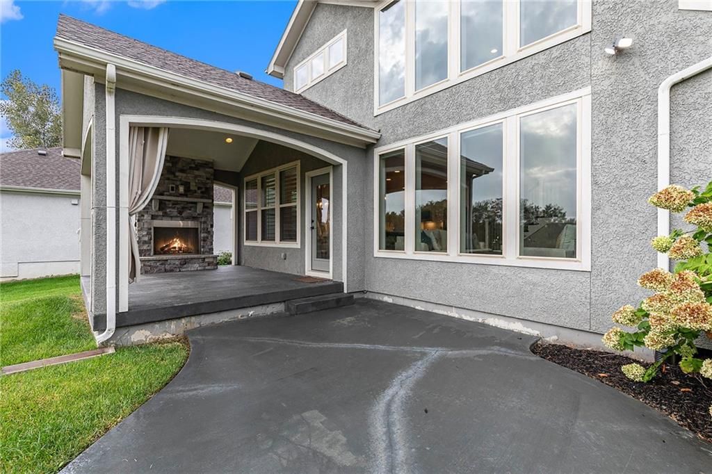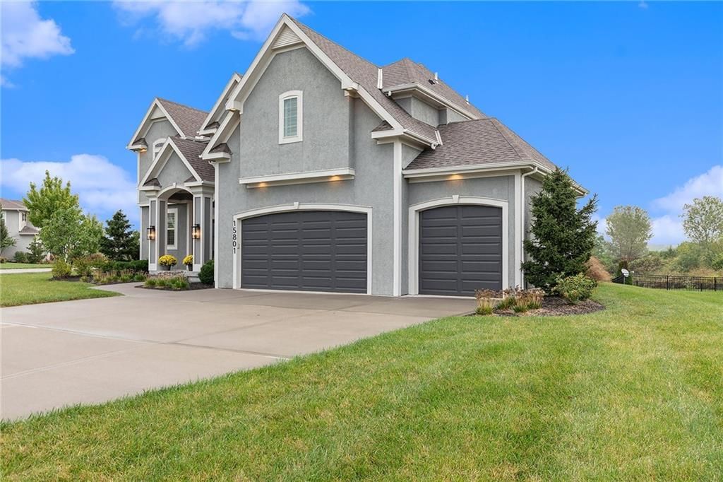 Experience luxury living in WatersEdge, one of Overland Park's premier communities known for its serene waterscapes, resort-style pool, and clubhouse - all located within the award-winning Blue Valley School District. This stunning Bailey two-story by Roeser Homes offers approximately 3,300 square feet of thoughtfully designed space, featuring four bedrooms and three and a half bathrooms. A pair of elegant double front doors welcome you into a warm and inviting interior that includes a formal dining room, a home office with custom built-ins, and rich hardwood floors throughout the main level. The soaring two-story hearth room showcases a dramatic stone fireplace, while a separate great room offers an additional fireplace, creating multiple cozy gathering spaces. The gourmet kitchen is beautifully appointed with stainless steel appliances, double ovens, a center island, and a custom bar complete with a wine cooler and wine rack. Upstairs, a split staircase leads to the luxurious primary suite, which includes a private sitting area with fireplace, a spa-like bathroom with an oversized shower, jetted tub, and dual vanities, and an expansive walk-in closet with convenient access to the laundry room. Three secondary bedrooms offer spacious walk-in closets, vaulted ceilings and one has an ensuite bath while the other two share a Jack and Jill bath. Outdoor living is just as impressive featuring a covered patio with a fireplace - perfect for entertaining or quiet evenings at home. Additional features include additional outlets built-in ProSlat wall hanging system in the three car oversized garage, an unfinished basement stubbed for a bath and a wet bar, and a mirrored wall for a workout space. Enjoy new fresh interior paint and numerous high-end upgrades including extensive elegant millwork around all windows, a Sonos audio system with ceiling speakers, plantation shutters, a security system and a sprinkler system. This home is a true reflection of pride in ownership.