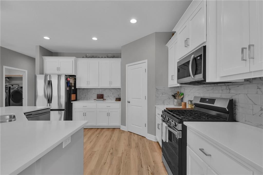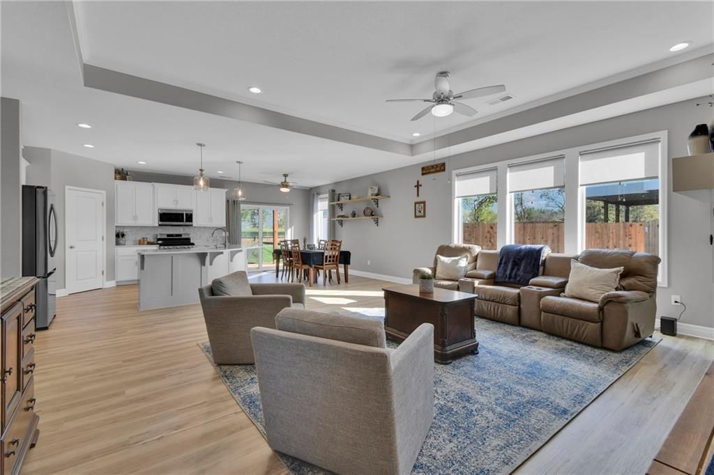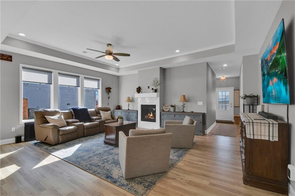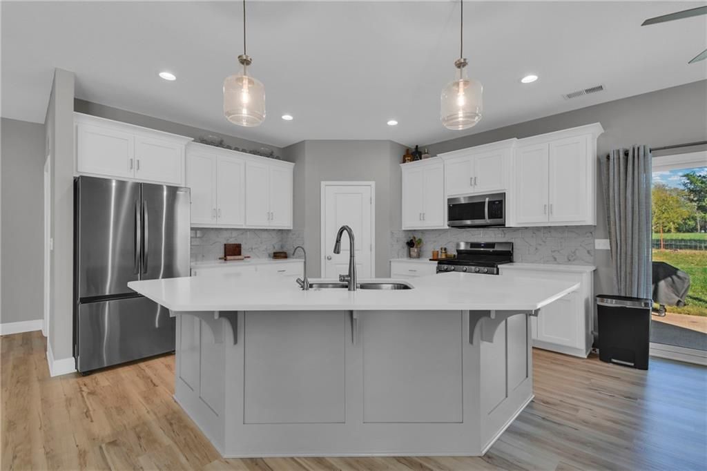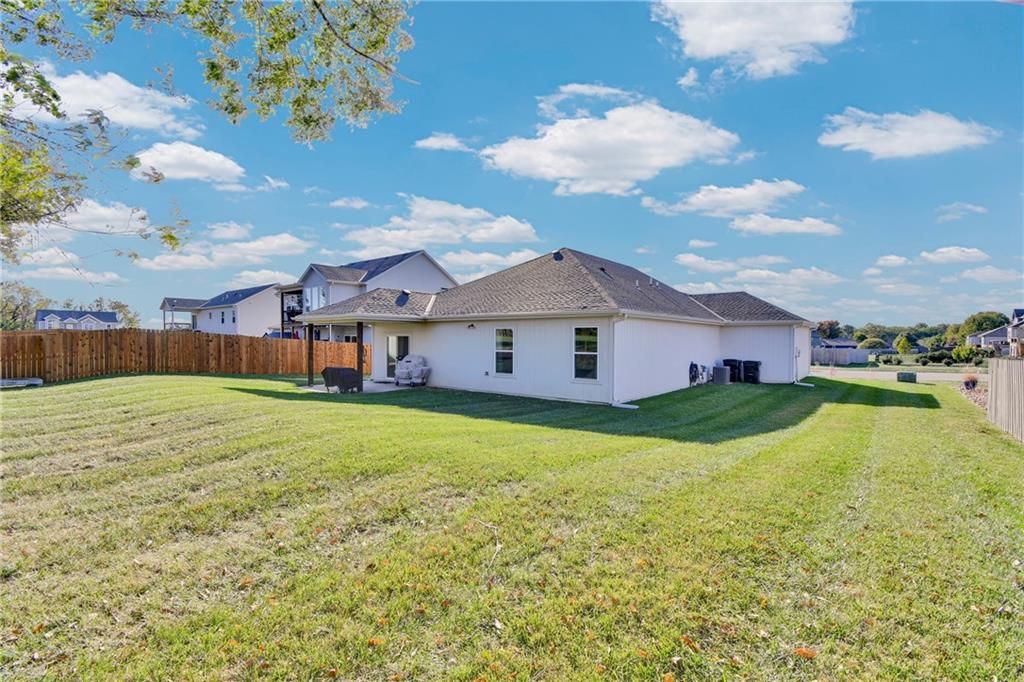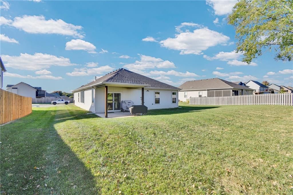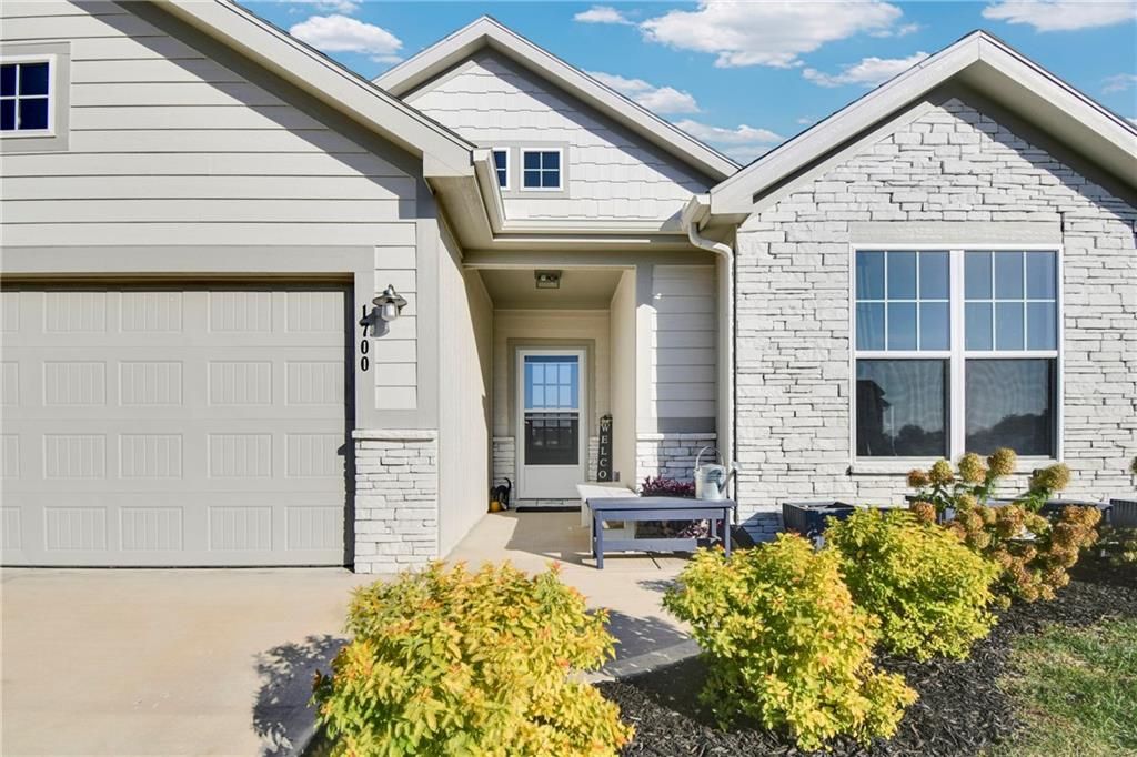Nearly New built home, ready for you. Welcome to Aster, a beautiful ranch-style home by Authentic Homes KC! This thoughtfully designed home is packed with luxurious upgrades and stylish touches throughout. Gorgeous & upgraded flooring offers both elegance and durability. This open-concept layout features a chef-inspired kitchen with quartz countertops, stainless steel appliances including a gas stove, custom cabinetry, a walk-in pantry, ample counter space, and a large center island that flows seamlessly into the spacious living room - perfect for entertaining. The master suite boasts a large bedroom, a spa-inspired bathroom with double vanity, custom tiled shower with bench seat, and a generous walk-in closet conveniently connected to the laundry room. Step outside to enjoy the expansive covered patio, large back patio, and beautifully manicured yard - ideal for relaxing or hosting gatherings. This home is move-in ready and easy to show - don't miss your chance to make it yours!