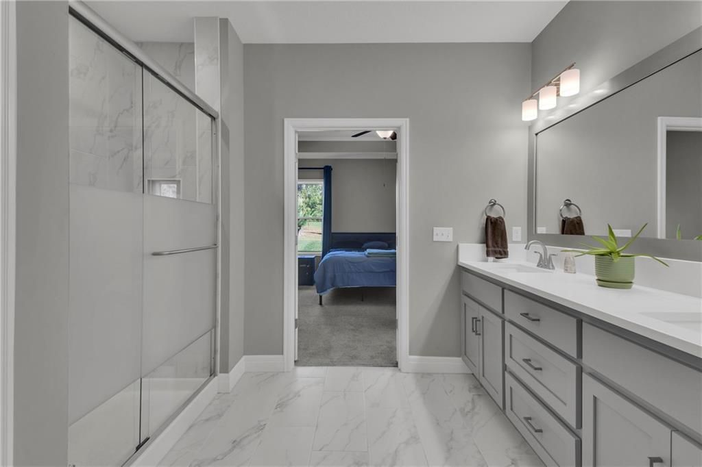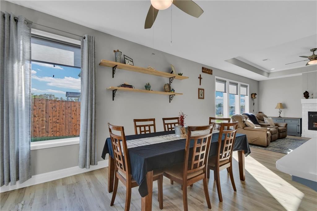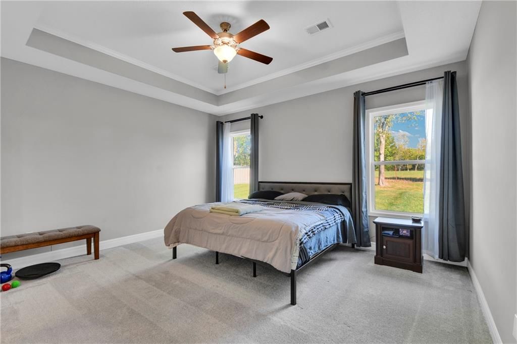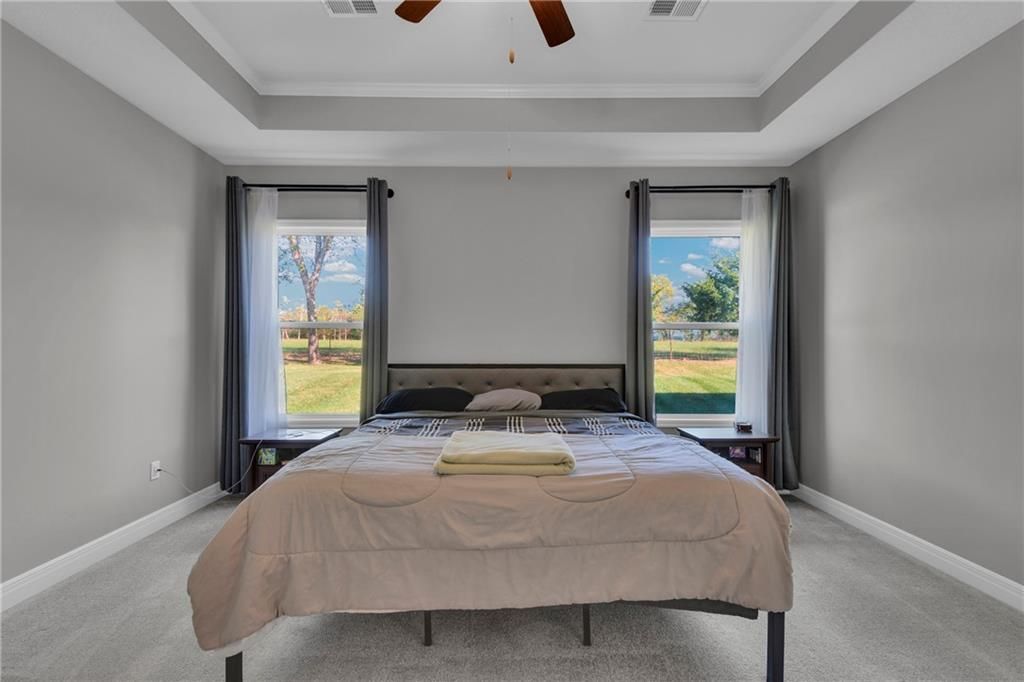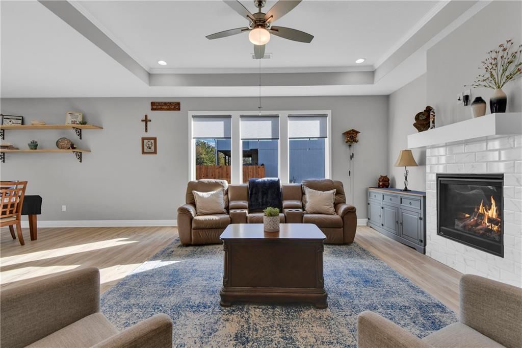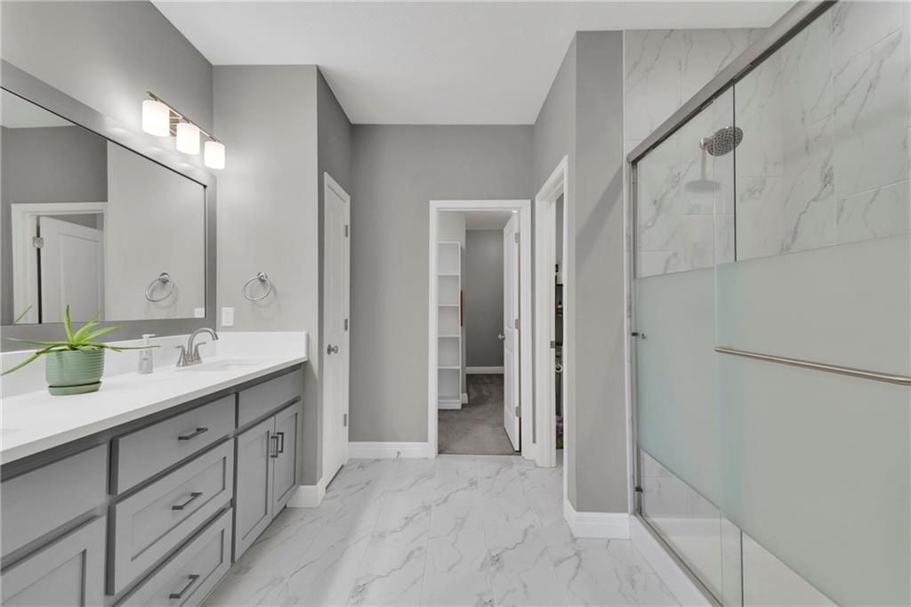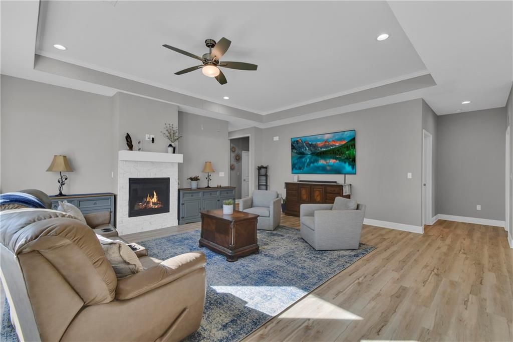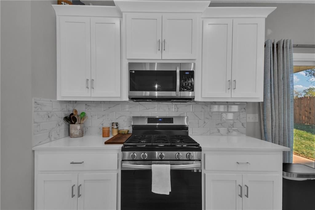 Nearly New built home, ready for you. Welcome to Aster, a beautiful ranch-style home by Authentic Homes KC! This thoughtfully designed home is packed with luxurious upgrades and stylish touches throughout. Gorgeous & upgraded flooring offers both elegance and durability. This open-concept layout features a chef-inspired kitchen with quartz countertops, stainless steel appliances including a gas stove, custom cabinetry, a walk-in pantry, ample counter space, and a large center island that flows seamlessly into the spacious living room - perfect for entertaining. The master suite boasts a large bedroom, a spa-inspired bathroom with double vanity, custom tiled shower with bench seat, and a generous walk-in closet conveniently connected to the laundry room. Step outside to enjoy the expansive covered patio, large back patio, and beautifully manicured yard - ideal for relaxing or hosting gatherings. This home is move-in ready and easy to show - don't miss your chance to make it yours!
