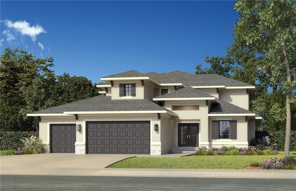The new 4 CAR TANDEM Rosedale 1.5 Story plan by SAB HOMES is now building on walk out lot 185 in a cul de sac in Century Farms for September MOVE IN. Beautiful modern farmhouse interior selection with warm wood, light colored walls, black and gold hardware, two story great room wood accent celling with painted beams, floating shelves, hallway wainscoting, wood ceiling in primary bedroom, sleek modern floating cabinets in primary bathroom with back lit black mirrors, white quartz and freestanding tub, front porch entry with double door entrance, large 14' covered deck along the back side of the house connecting the dining room to the primary suite, plus a covered patio at the walkout lower level. Pocket laundry in the primary closet and a full 2nd laundry upstairs by the bedrooms. This home has it all with a grand two story great room, main floor primary bedroom, office or formal dining room space, 3 bedrooms upstairs and a 2nd laundry. This sleek farmhouse has striking curb appeal with a white stucco exterior, black fox doors and shutters, warm wood accents and real stone trim. Optional finished basement with 1164 additional square feet can be added with a 5th bedroom/ fitness room/ hobby space or extra office. There is still time to make some of your design selections since it's under construction. Come join the fun in Century Farms, an upscale new home community in Overland Park near Bluhawk shopping center, Heritage Park and the Overland Park Arboretum. Blue Valley Schools