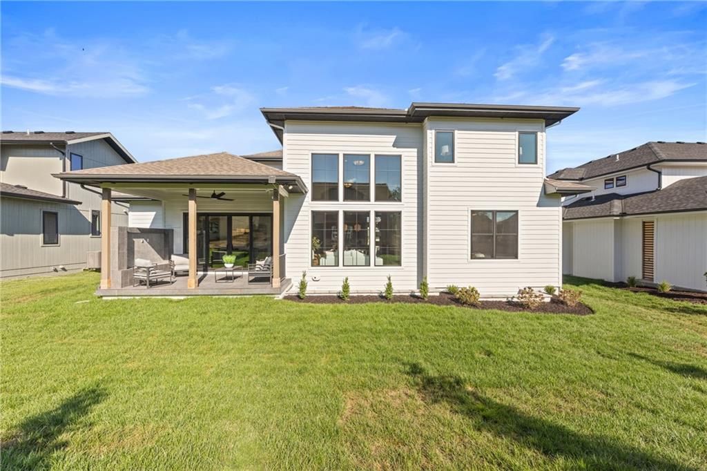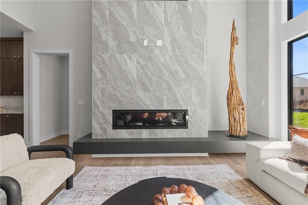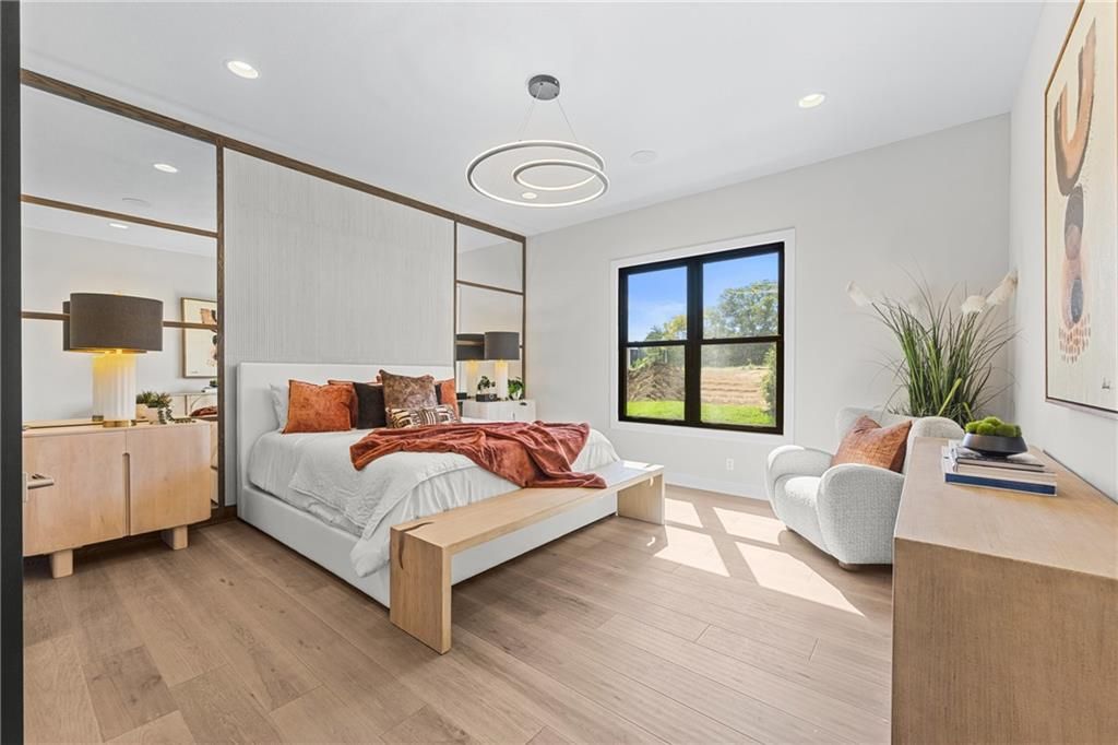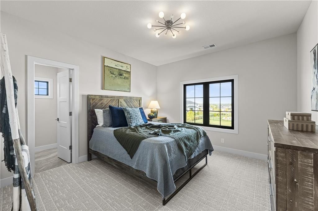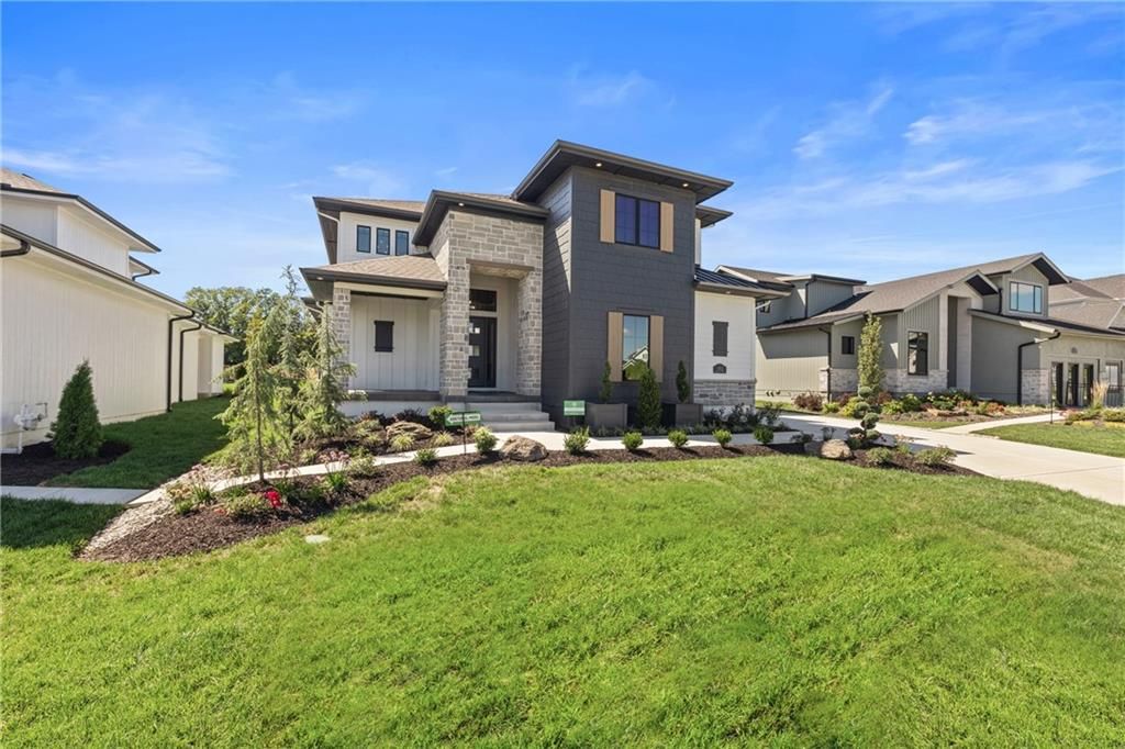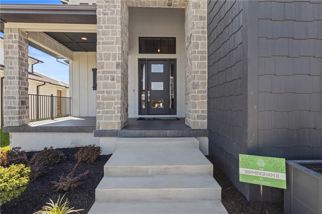 MODEL HOME is now FOR SALE! The 1.5 Story Birmingham II plan by SAB HOMES is a spectacular new 5 BEDROOM plan with an impressive mix of modern sophistication loaded with premium new upgrades. This home offers 3 levels of finished space at just over 4600 square feet. As you enter, this plan features a soaring two story ceiling, fantastic new modern lighting, two story great room with floor to ceiling tile fireplace with floating hearth and black linear fireplace. The spacious dining room showcases a sophisticated accent wall with mirrors and floating shelves and a double slider door to access the covered 17' x 10' tiled patio. The butlers pantry has an extra MOEN sink, water bottle filler and glass swing door to Chef's kitchen with premium CAFE appliances and DEKTON waterfall island and backsplash. Explore the main level primary bedroom with tile headboard accent wall with mirrored walnut side trim, spacious bath with freestanding tub and large closet. There are four bedrooms up plus a loft space at the landing ideal for upstairs game room or craft room. There is a space for everyone in this home with three floors and 5 bedrooms. The lower level offers 1339 sf of additional finished space ideal for entertaining or exercising with a whiskey wall bar with mirrored tiles and floating shelves, fitness room with double glass doors and Finnleo Sauna, full bath, and theater room. Don't miss the extra features including a guest bath backlit rock wall, extended 3rd car bump out for extra storage, split 3 car garage, real stone trim, large front porch, tiled front porch and patio TV wall. Come join the fun in Century Farms, a unique one of a kind upscale new home community in Overland Park. Century Farms has a spectacular clubhouse with a fitness center, resort style swimming pool, two pickle-ball courts, kids play area and community garden. It's located near the new Bluhawk shopping center, Heritage Park and the OP Arboretum. BLUE VALLEY SCHOOLS