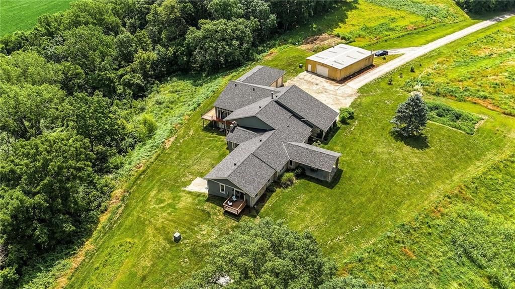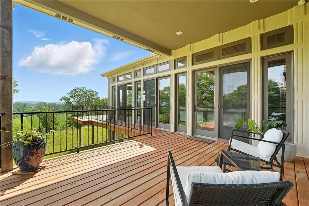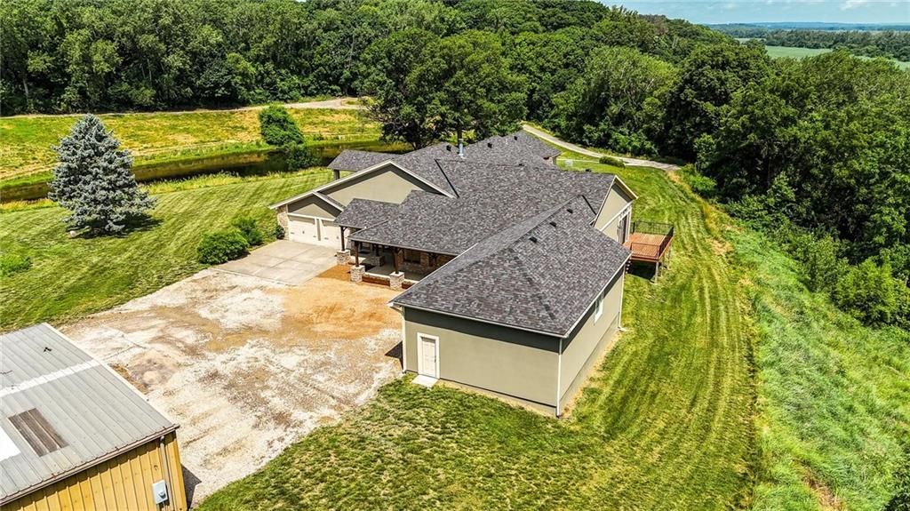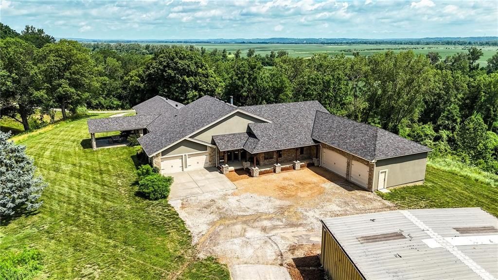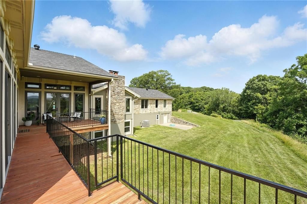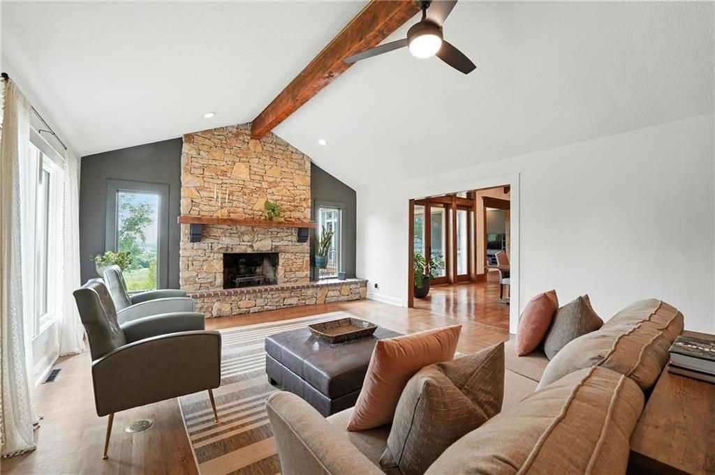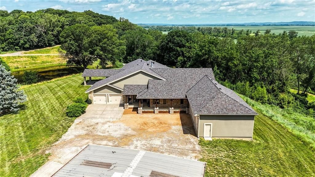 This incredible home blends architectural character with modern updates across a spacious layout full of thoughtful details. A stunning stone fireplace anchors the vaulted dining room with exposed beams and warm wood ceilings, creating a dramatic and inviting space. The updated kitchen features quartz countertops, a gas range, oversized island, and stylish pendant lighting, all open to the main living areas for seamless flow. The living room is a showstopper with a coffered ceiling, wood floors, and large windows that frame peaceful views. Multiple living and family rooms offer flexibility for everyday life and entertaining, with each space offering its own charm. The primary suite includes a large walk-in closet and luxurious bath with dual vanities and a walk-in tile shower. Additional bedrooms offer generous space with walk-in closets and ceiling fans. Situated on 50 acres in Leavenworth County and the Lansing School District, this property includes a separate guest home, pond, a 50-foot Butler building with electricity, water, and a bathroom, and land teeming with wildlife including deer, turkey, and bald eagles. The expansive deck offers sweeping views over the Missouri River valley, creating the perfect backdrop for relaxing or hosting. Updates throughout include a 2021 remodel, new roof (2024), HVAC (2024), tankless water heater (2022), fresh exterior paint, and more. This home offers timeless craftsmanship, thoughtful upgrades, and unbeatable space inside and out.