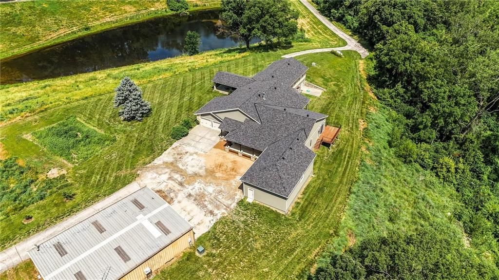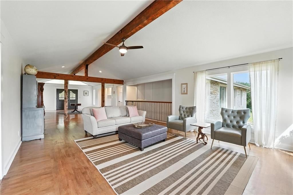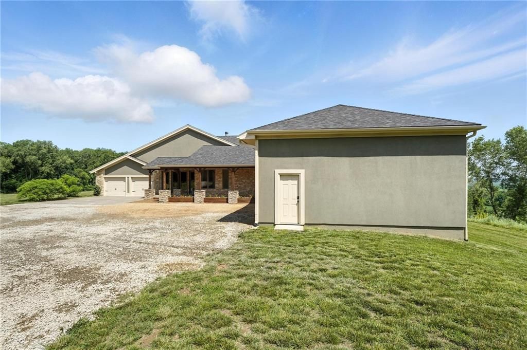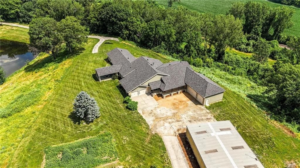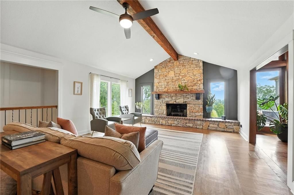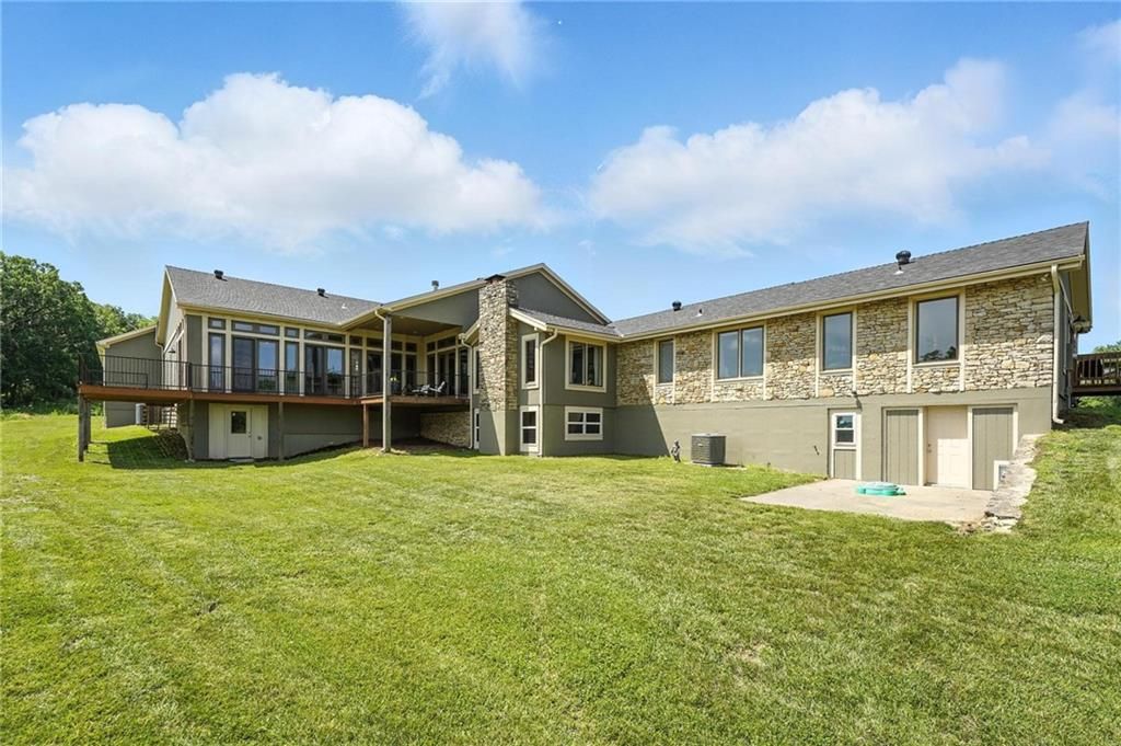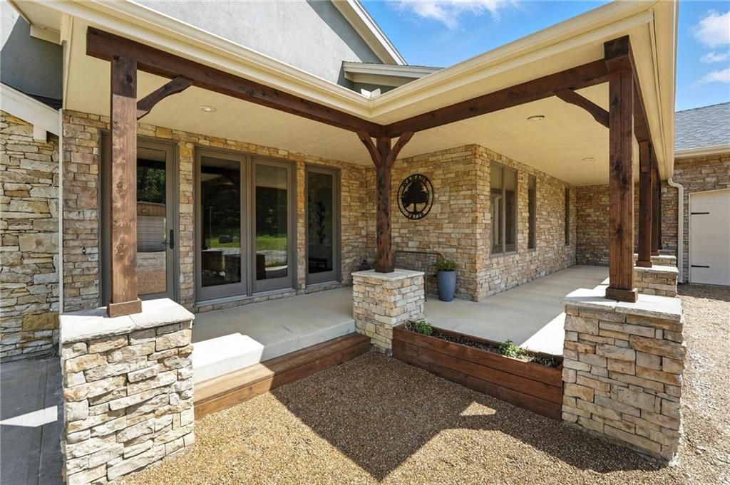 This incredible home blends architectural character with modern updates across a spacious layout full of thoughtful details. A stunning stone fireplace anchors the vaulted dining room with exposed beams and warm wood ceilings, creating a dramatic and inviting space. The updated kitchen features quartz countertops, a gas range, oversized island, and stylish pendant lighting, all open to the main living areas for seamless flow. The living room is a showstopper with a coffered ceiling, wood floors, and large windows that frame peaceful views. Multiple living and family rooms offer flexibility for everyday life and entertaining, with each space offering its own charm. The primary suite includes a large walk-in closet and luxurious bath with dual vanities and a walk-in tile shower. Additional bedrooms offer generous space with walk-in closets and ceiling fans. Situated on 50 acres in Leavenworth County and the Lansing School District, this property includes a separate guest home, pond, a 50-foot Butler building with electricity, water, and a bathroom, and land teeming with wildlife including deer, turkey, and bald eagles. The expansive deck offers sweeping views over the Missouri River valley, creating the perfect backdrop for relaxing or hosting. Updates throughout include a 2021 remodel, new roof (2024), HVAC (2024), tankless water heater (2022), fresh exterior paint, and more. This home offers timeless craftsmanship, thoughtful upgrades, and unbeatable space inside and out.