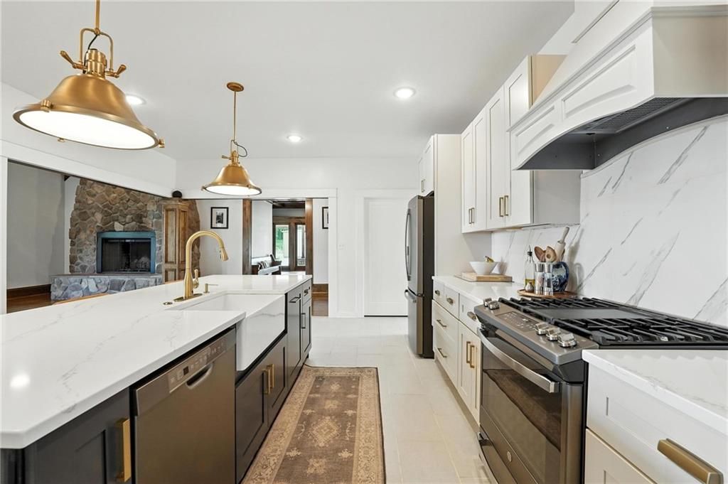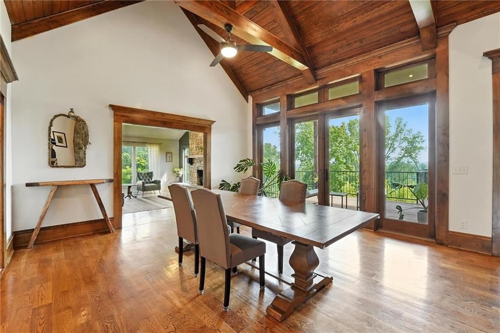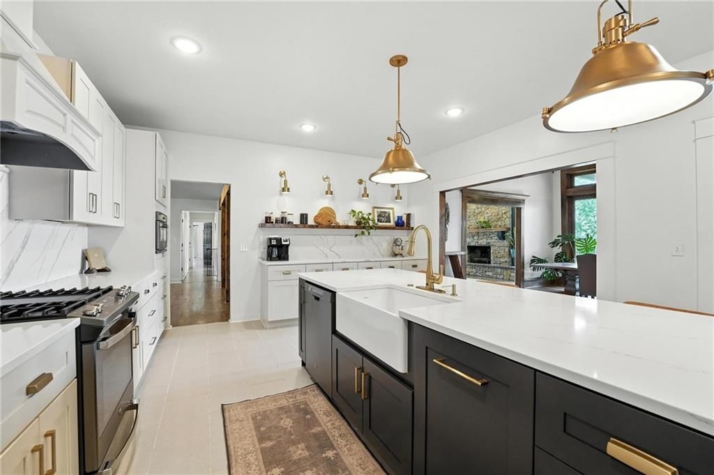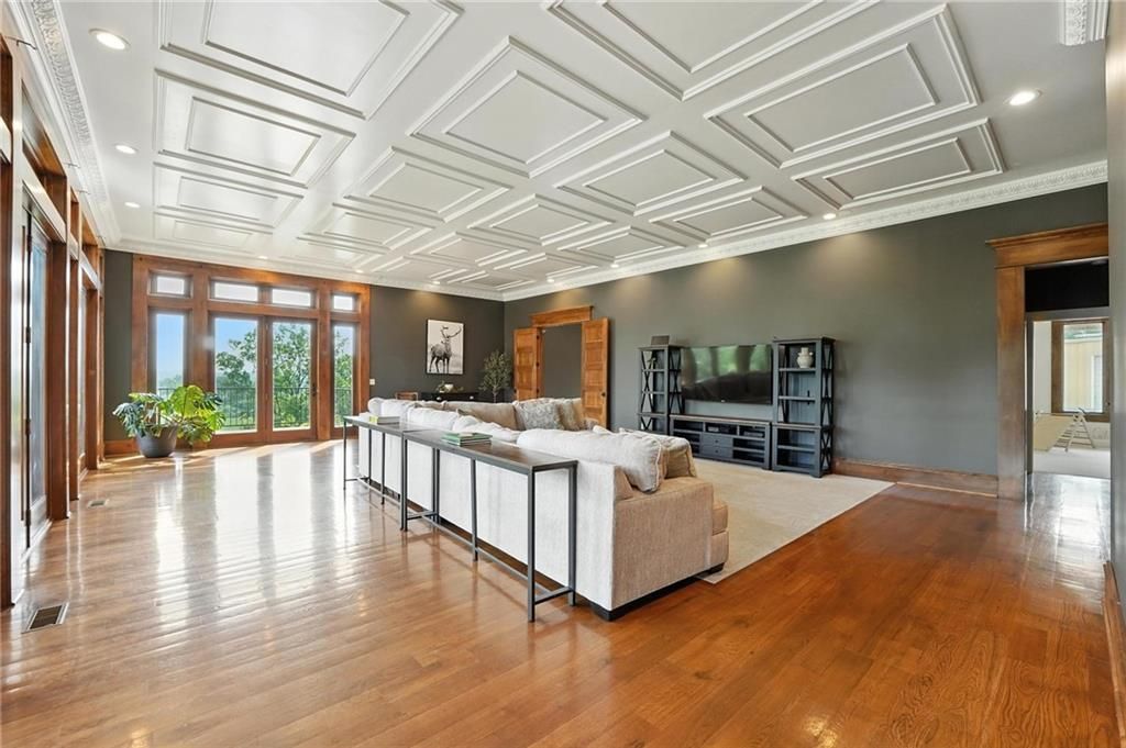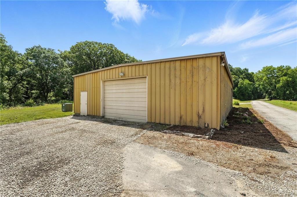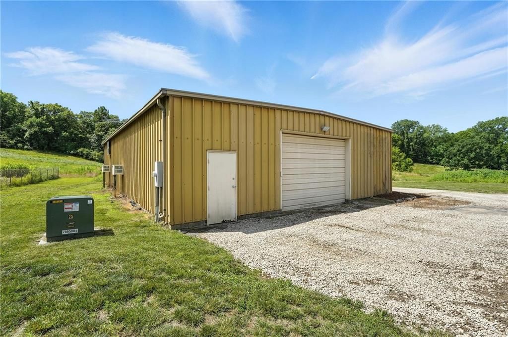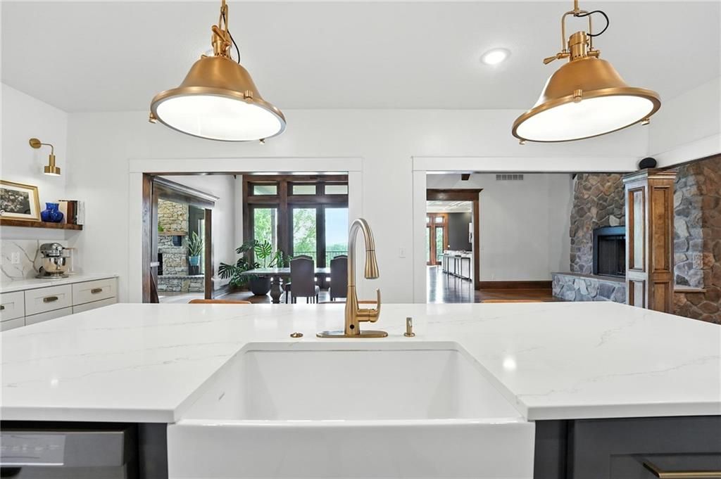 This incredible home blends architectural character with modern updates across a spacious layout full of thoughtful details. A stunning stone fireplace anchors the vaulted dining room with exposed beams and warm wood ceilings, creating a dramatic and inviting space. The updated kitchen features quartz countertops, a gas range, oversized island, and stylish pendant lighting, all open to the main living areas for seamless flow. The living room is a showstopper with a coffered ceiling, wood floors, and large windows that frame peaceful views. Multiple living and family rooms offer flexibility for everyday life and entertaining, with each space offering its own charm. The primary suite includes a large walk-in closet and luxurious bath with dual vanities and a walk-in tile shower. Additional bedrooms offer generous space with walk-in closets and ceiling fans. Situated on 50 acres in Leavenworth County and the Lansing School District, this property includes a separate guest home, pond, a 50-foot Butler building with electricity, water, and a bathroom, and land teeming with wildlife including deer, turkey, and bald eagles. The expansive deck offers sweeping views over the Missouri River valley, creating the perfect backdrop for relaxing or hosting. Updates throughout include a 2021 remodel, new roof (2024), HVAC (2024), tankless water heater (2022), fresh exterior paint, and more. This home offers timeless craftsmanship, thoughtful upgrades, and unbeatable space inside and out.