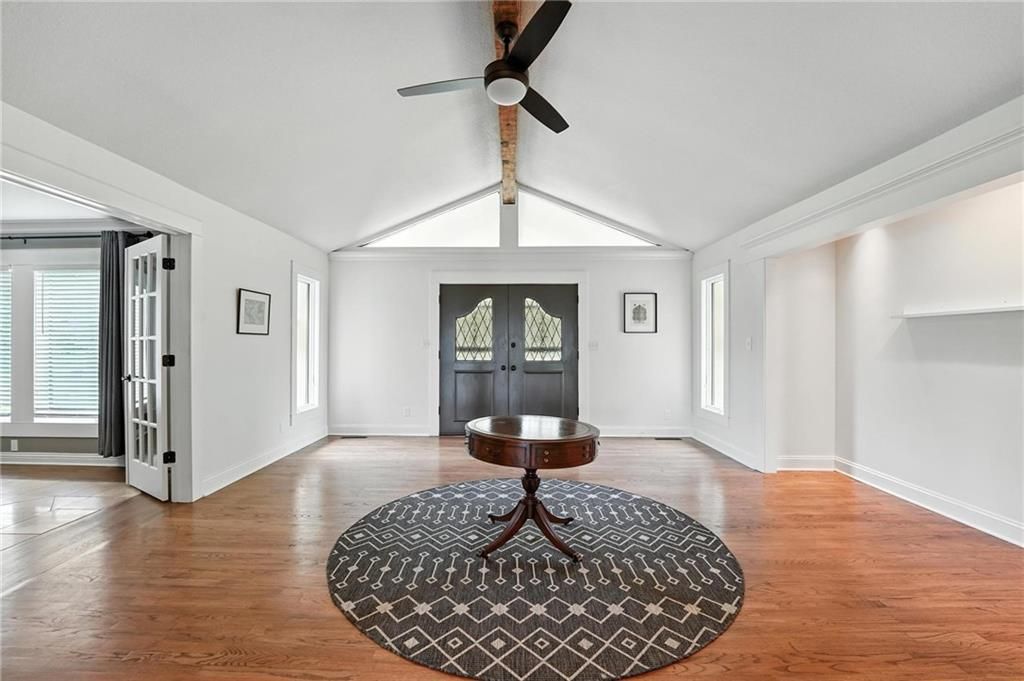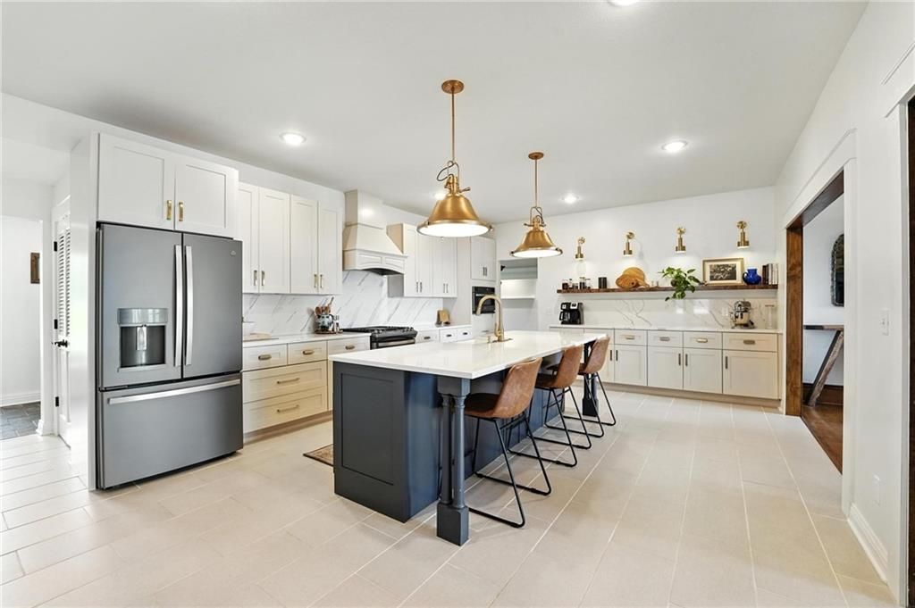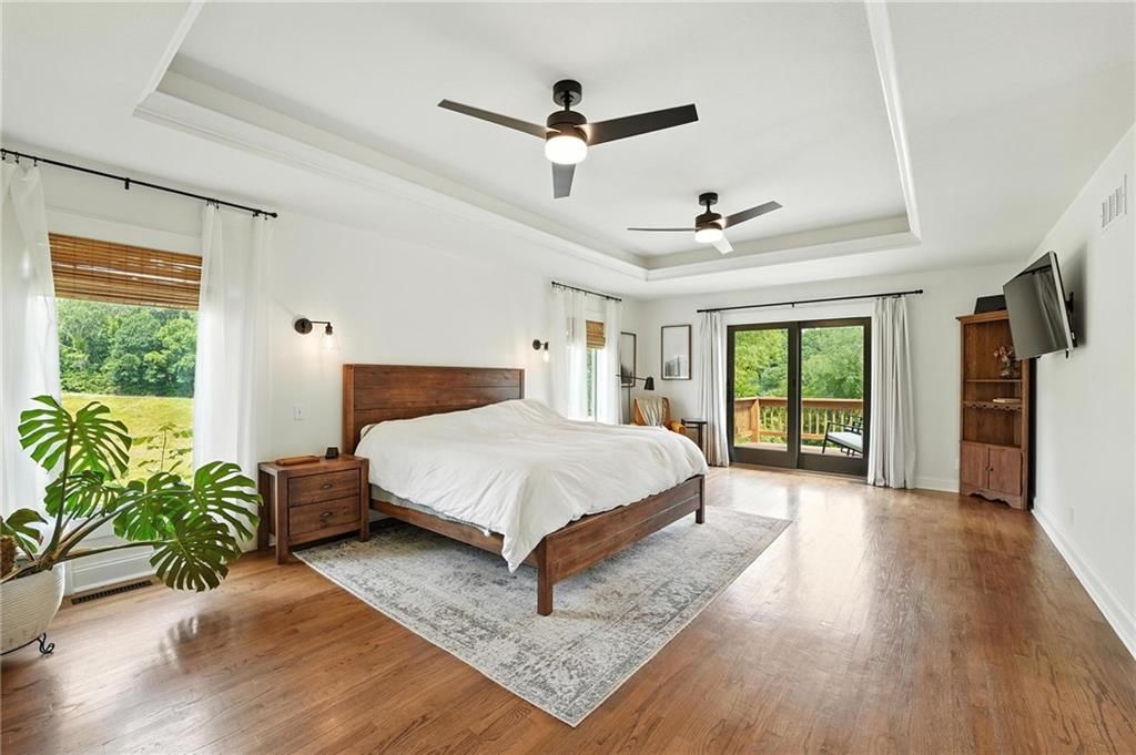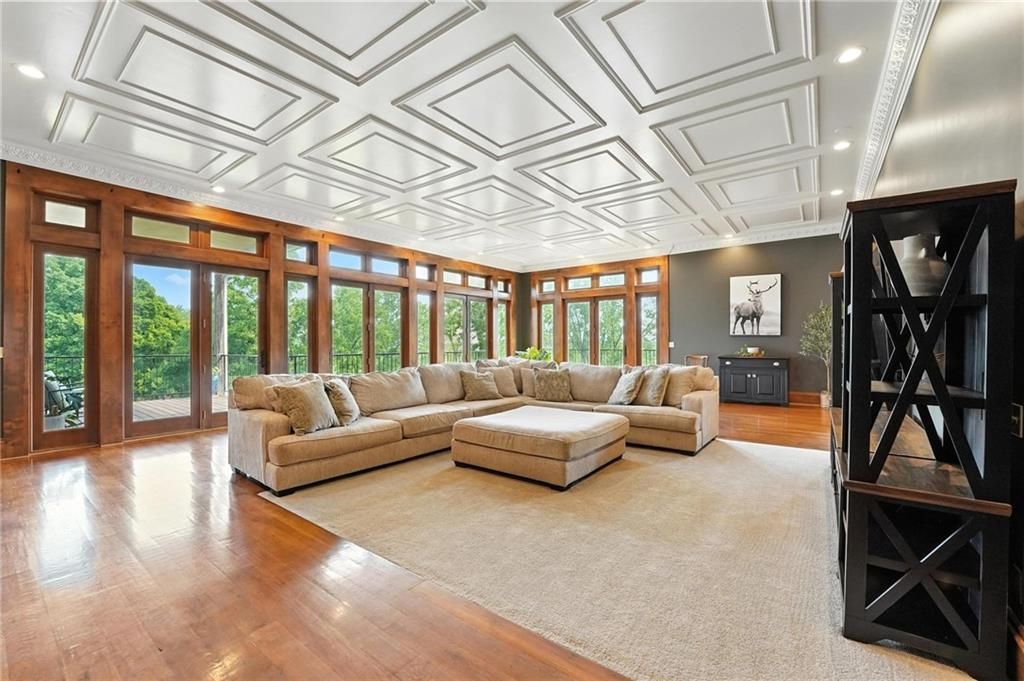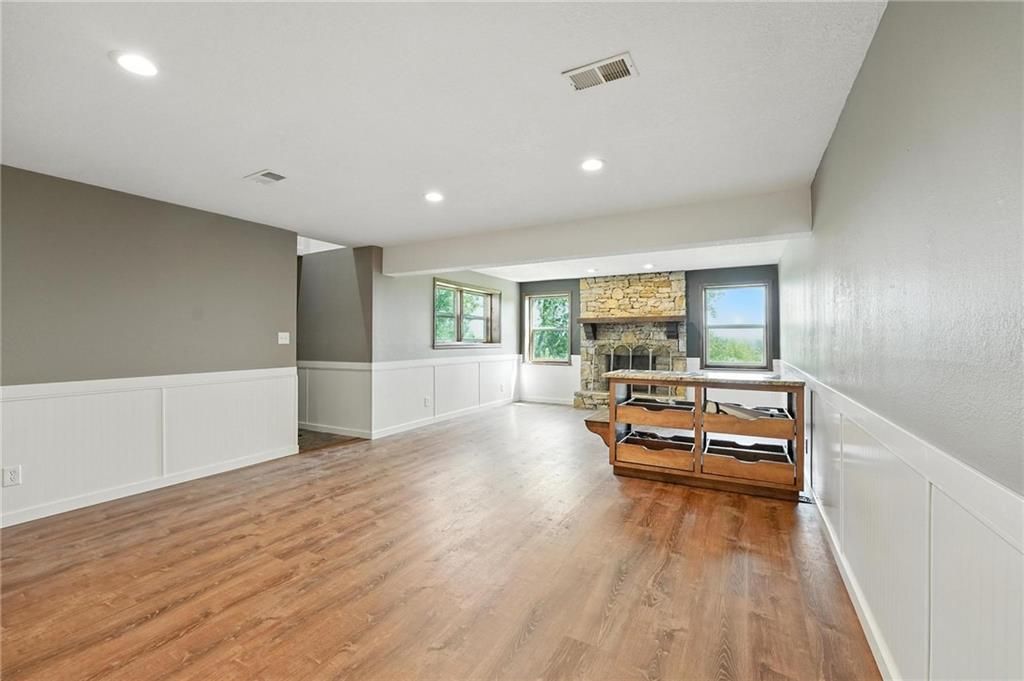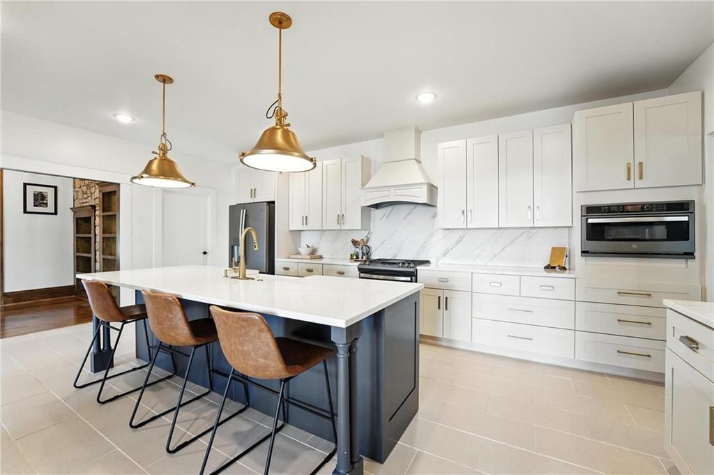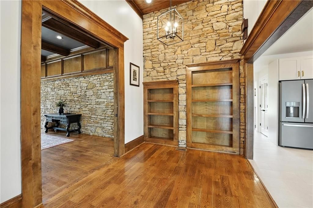 This incredible home blends architectural character with modern updates across a spacious layout full of thoughtful details. A stunning stone fireplace anchors the vaulted dining room with exposed beams and warm wood ceilings, creating a dramatic and inviting space. The updated kitchen features quartz countertops, a gas range, oversized island, and stylish pendant lighting, all open to the main living areas for seamless flow. The living room is a showstopper with a coffered ceiling, wood floors, and large windows that frame peaceful views. Multiple living and family rooms offer flexibility for everyday life and entertaining, with each space offering its own charm. The primary suite includes a large walk-in closet and luxurious bath with dual vanities and a walk-in tile shower. Additional bedrooms offer generous space with walk-in closets and ceiling fans. Situated on 50 acres in Leavenworth County and the Lansing School District, this property includes a separate guest home, pond, a 50-foot Butler building with electricity, water, and a bathroom, and land teeming with wildlife including deer, turkey, and bald eagles. The expansive deck offers sweeping views over the Missouri River valley, creating the perfect backdrop for relaxing or hosting. Updates throughout include a 2021 remodel, new roof (2024), HVAC (2024), tankless water heater (2022), fresh exterior paint, and more. This home offers timeless craftsmanship, thoughtful upgrades, and unbeatable space inside and out.