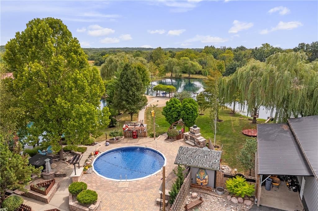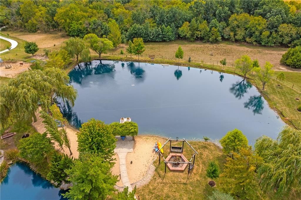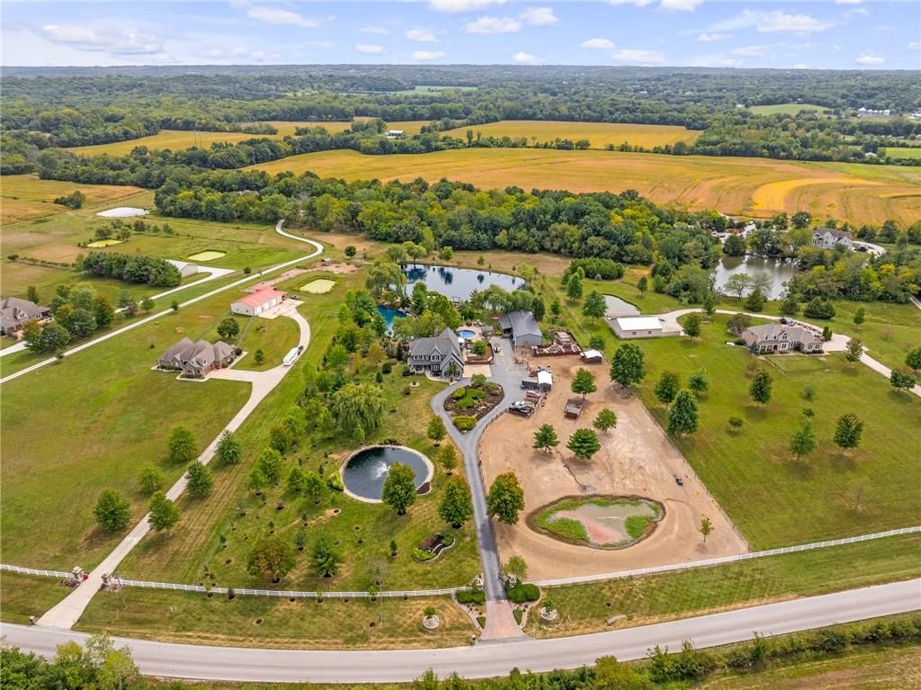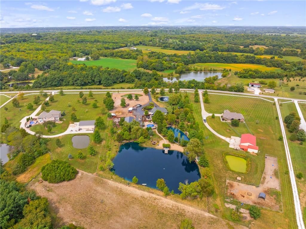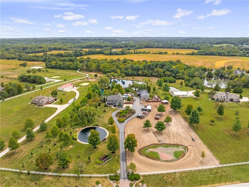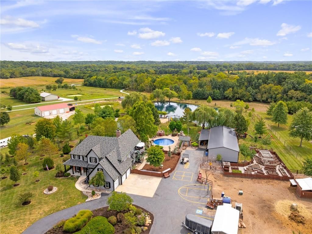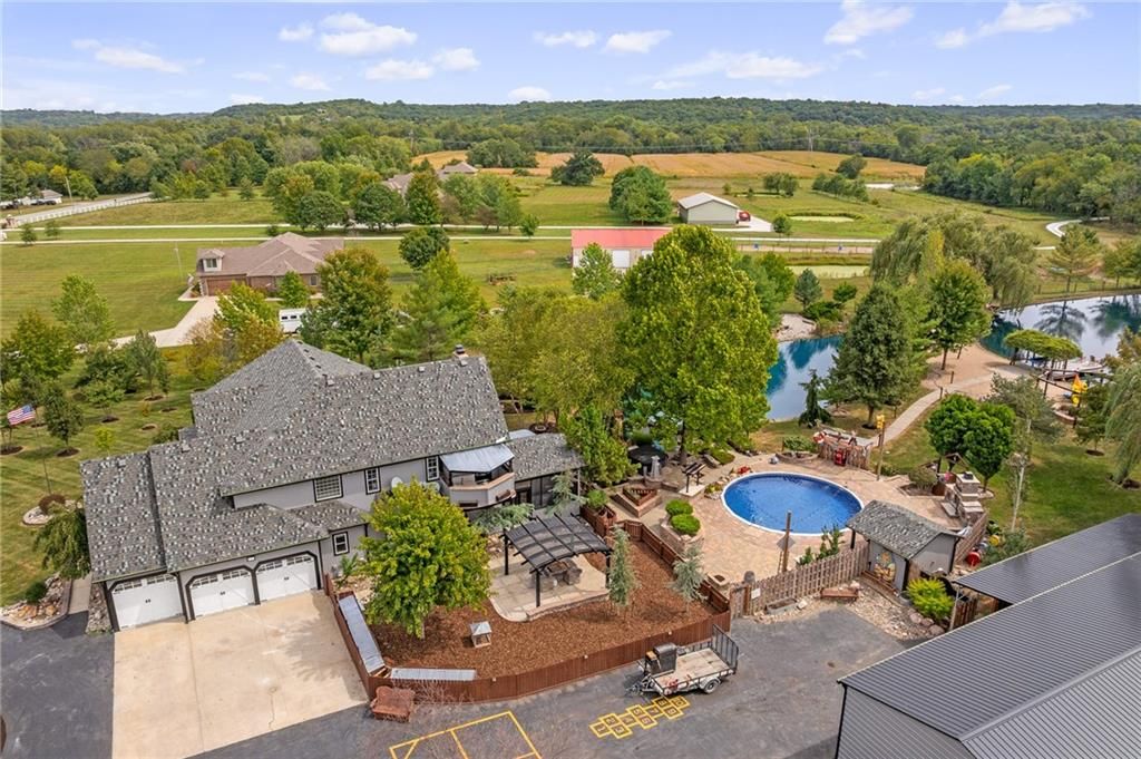 Live, work, and play like never before on this fully fenced, gated 5-acre estate on blacktop in Lone Jack - designed for entertaining, outdoor living, and enjoying the land your way. Whether you're into fishing, paddleboarding, raising chickens, gardening, hosting parties, or running a business from home, this unique property makes it possible. Three scenic ponds set the stage - one with sandy beach, dock, playhouse with hurricane deck, and zip line; another with a 12-foot stone waterfall framed by weeping willows. Outdoor living includes a pool, festive bar, outdoor shower, firepits, fountains, basketball court, and striped parking for nine. A vintage merry-go-round, playground, and wisteria-draped pergola add whimsy, while mature landscaping and unique trees create a lush, park-like setting. Grow and raise what you love: a fenced livestock area with shelters and duck pond supports chickens, goats, or a horse. A large raised garden with drip irrigation and auto-watering is ready for your green thumb. Built in 2006, the two-story home offers comfort and space with hard-surface flooring on the main level, five fireplaces, formal dining, home office, and hearth room kitchen with island seating and Viking six-burner cooktop. French doors open to a fenced dog yard with pergola and hibachi grill - perfect for pets and casual cookouts. Upstairs, four bedrooms each have private baths. The oversized primary suite includes a fireplace, sitting area, walk-in closet, and private covered balcony with mini split - your retreat above it all. The walkout lower level is built for fun and function, featuring a theater, arcade, full bar, non-conforming fifth bedroom, full bath, and access to a saloon-style patio with hot tub and firepit. A newly built outbuilding adds flexibility - with concrete floor, two oversized overhead doors, built-in compressor, and plumbing for future living quarters. Ideal for equipment, hobbies, or home-based business use.