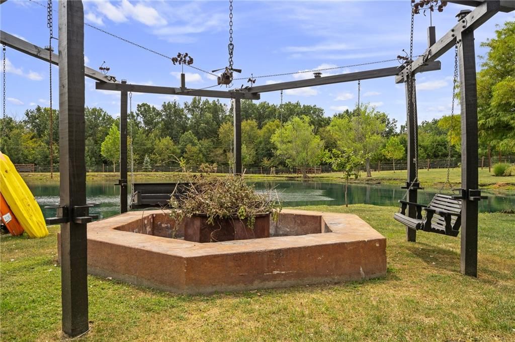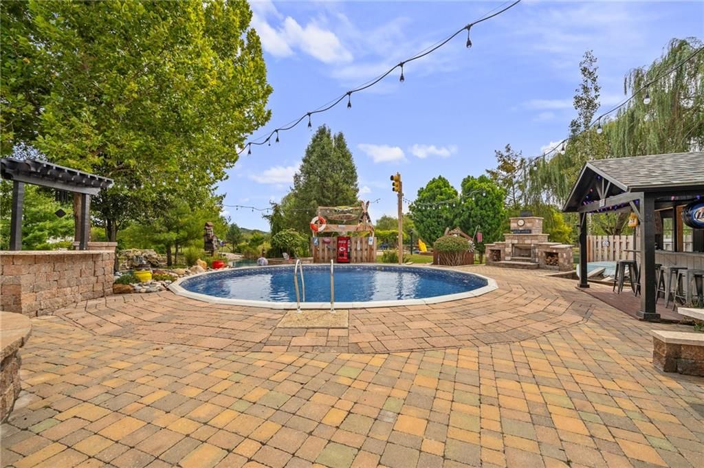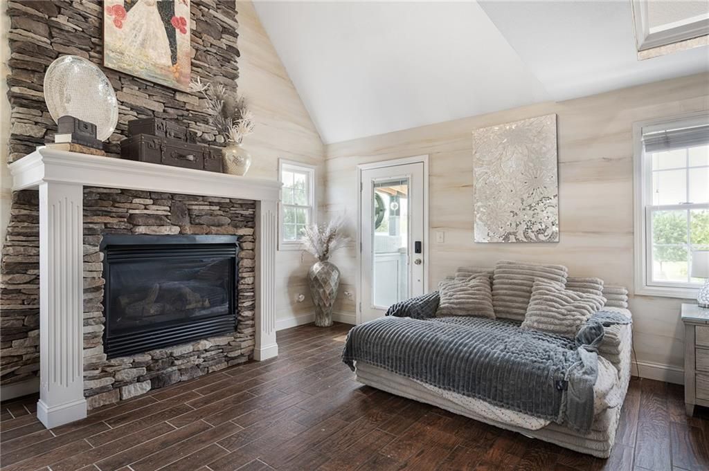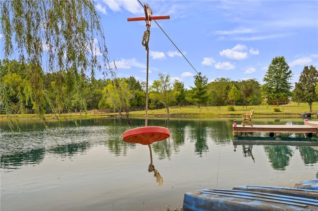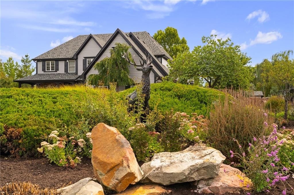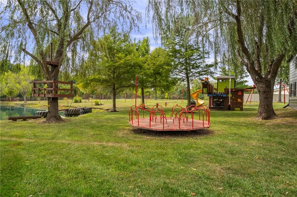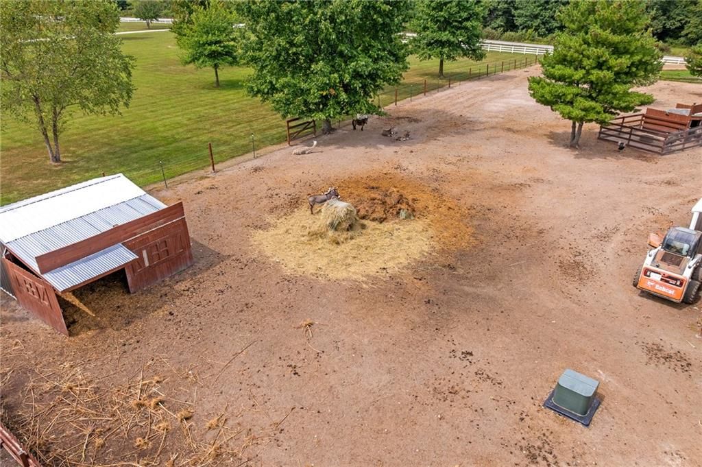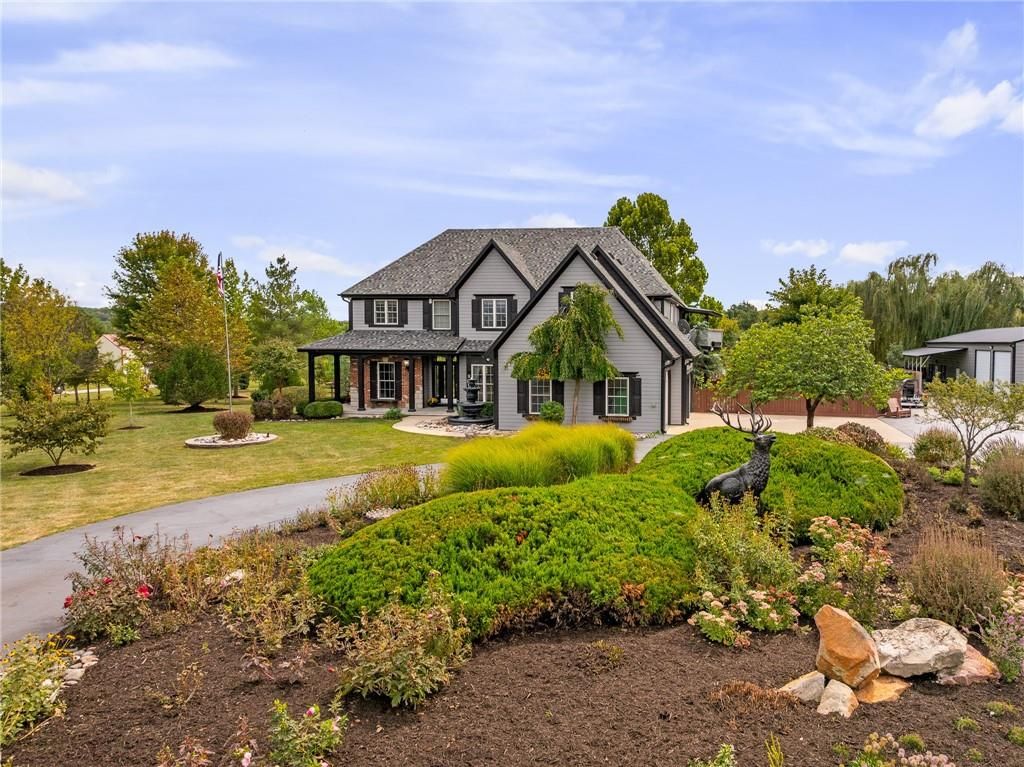 Live, work, and play like never before on this fully fenced, gated 5-acre estate on blacktop in Lone Jack - designed for entertaining, outdoor living, and enjoying the land your way. Whether you're into fishing, paddleboarding, raising chickens, gardening, hosting parties, or running a business from home, this unique property makes it possible. Three scenic ponds set the stage - one with sandy beach, dock, playhouse with hurricane deck, and zip line; another with a 12-foot stone waterfall framed by weeping willows. Outdoor living includes a pool, festive bar, outdoor shower, firepits, fountains, basketball court, and striped parking for nine. A vintage merry-go-round, playground, and wisteria-draped pergola add whimsy, while mature landscaping and unique trees create a lush, park-like setting. Grow and raise what you love: a fenced livestock area with shelters and duck pond supports chickens, goats, or a horse. A large raised garden with drip irrigation and auto-watering is ready for your green thumb. Built in 2006, the two-story home offers comfort and space with hard-surface flooring on the main level, five fireplaces, formal dining, home office, and hearth room kitchen with island seating and Viking six-burner cooktop. French doors open to a fenced dog yard with pergola and hibachi grill - perfect for pets and casual cookouts. Upstairs, four bedrooms each have private baths. The oversized primary suite includes a fireplace, sitting area, walk-in closet, and private covered balcony with mini split - your retreat above it all. The walkout lower level is built for fun and function, featuring a theater, arcade, full bar, non-conforming fifth bedroom, full bath, and access to a saloon-style patio with hot tub and firepit. A newly built outbuilding adds flexibility - with concrete floor, two oversized overhead doors, built-in compressor, and plumbing for future living quarters. Ideal for equipment, hobbies, or home-based business use.