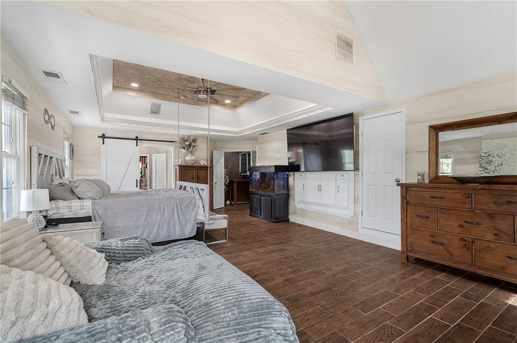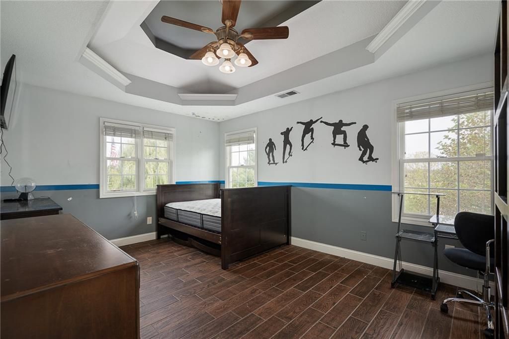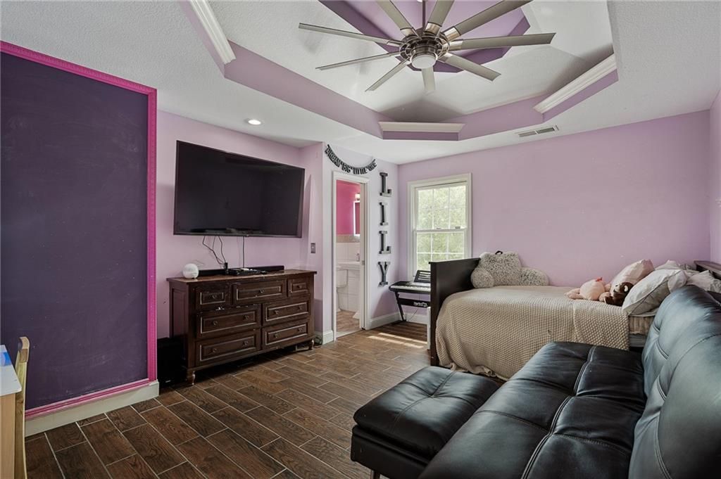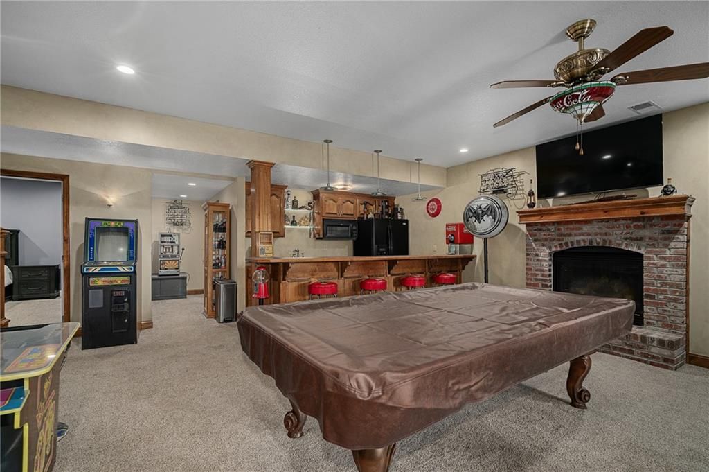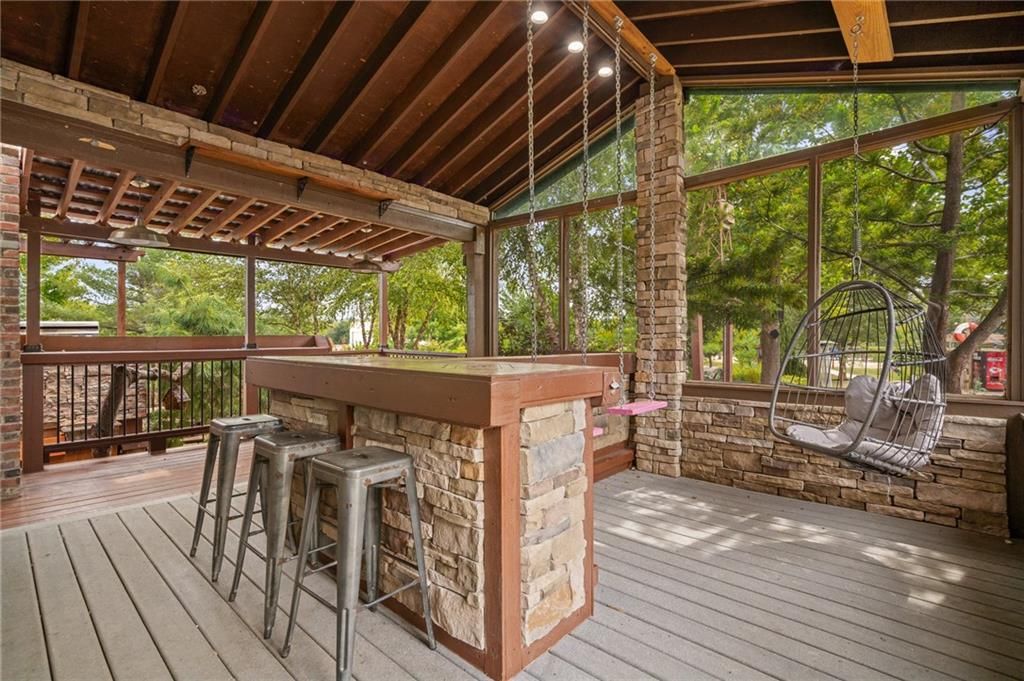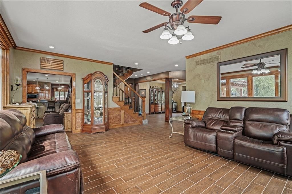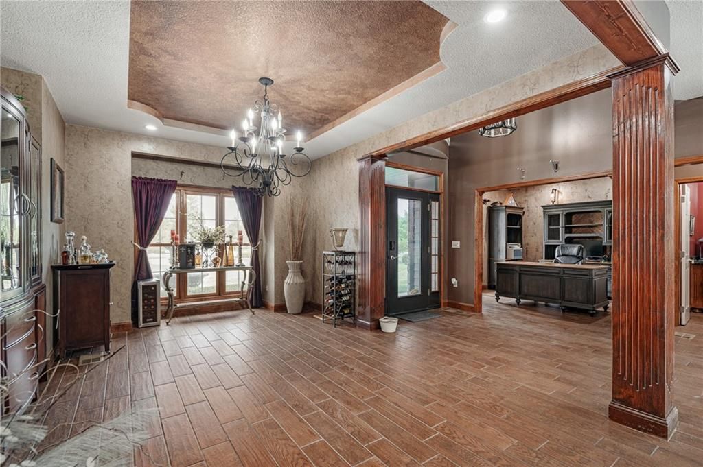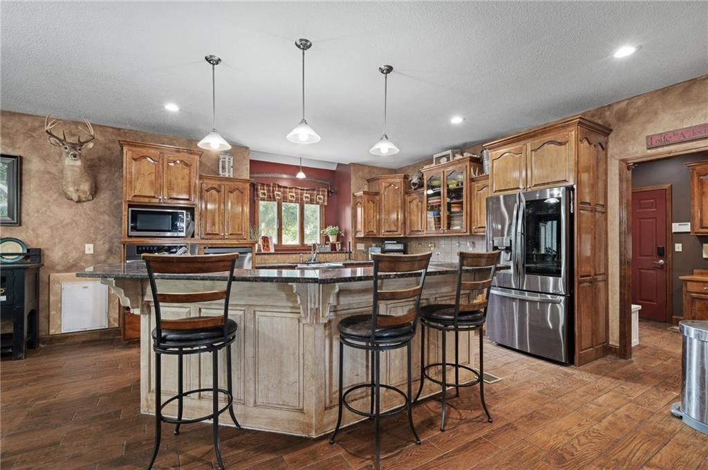 Live, work, and play like never before on this fully fenced, gated 5-acre estate on blacktop in Lone Jack - designed for entertaining, outdoor living, and enjoying the land your way. Whether you're into fishing, paddleboarding, raising chickens, gardening, hosting parties, or running a business from home, this unique property makes it possible. Three scenic ponds set the stage - one with sandy beach, dock, playhouse with hurricane deck, and zip line; another with a 12-foot stone waterfall framed by weeping willows. Outdoor living includes a pool, festive bar, outdoor shower, firepits, fountains, basketball court, and striped parking for nine. A vintage merry-go-round, playground, and wisteria-draped pergola add whimsy, while mature landscaping and unique trees create a lush, park-like setting. Grow and raise what you love: a fenced livestock area with shelters and duck pond supports chickens, goats, or a horse. A large raised garden with drip irrigation and auto-watering is ready for your green thumb. Built in 2006, the two-story home offers comfort and space with hard-surface flooring on the main level, five fireplaces, formal dining, home office, and hearth room kitchen with island seating and Viking six-burner cooktop. French doors open to a fenced dog yard with pergola and hibachi grill - perfect for pets and casual cookouts. Upstairs, four bedrooms each have private baths. The oversized primary suite includes a fireplace, sitting area, walk-in closet, and private covered balcony with mini split - your retreat above it all. The walkout lower level is built for fun and function, featuring a theater, arcade, full bar, non-conforming fifth bedroom, full bath, and access to a saloon-style patio with hot tub and firepit. A newly built outbuilding adds flexibility - with concrete floor, two oversized overhead doors, built-in compressor, and plumbing for future living quarters. Ideal for equipment, hobbies, or home-based business use.