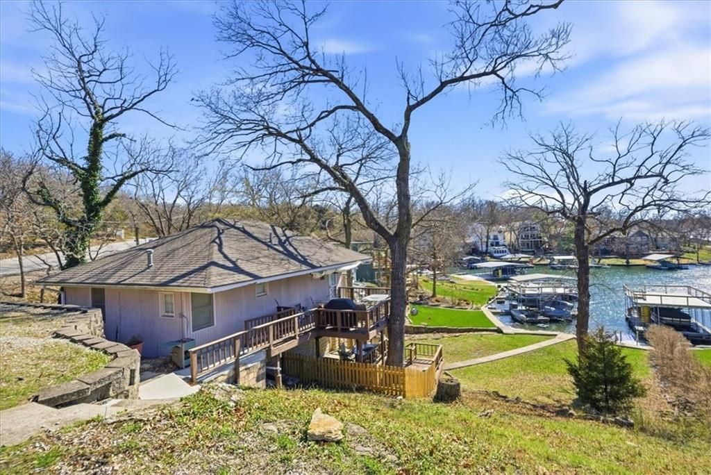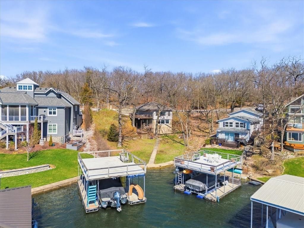 Great Tier 1 Lake Front property with double decker dock in desirable cove. Just under 1/4 acre, this space gives you the availability to move right in, remodel to your taste, or start fresh and build your dream lake home! Currently situated, the upper level features a spacious living room, full bathroom, and two bedrooms. Lower level features an additional living room, full kitchen, and additional full bath. Both levels do have exterior access with deck and patio. Lots of yard space for laying our or playing a set of corn hole!