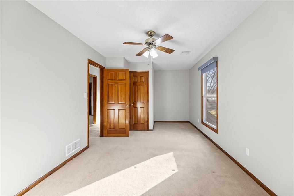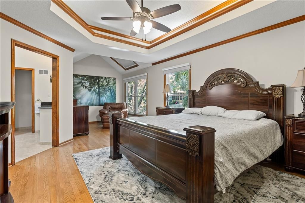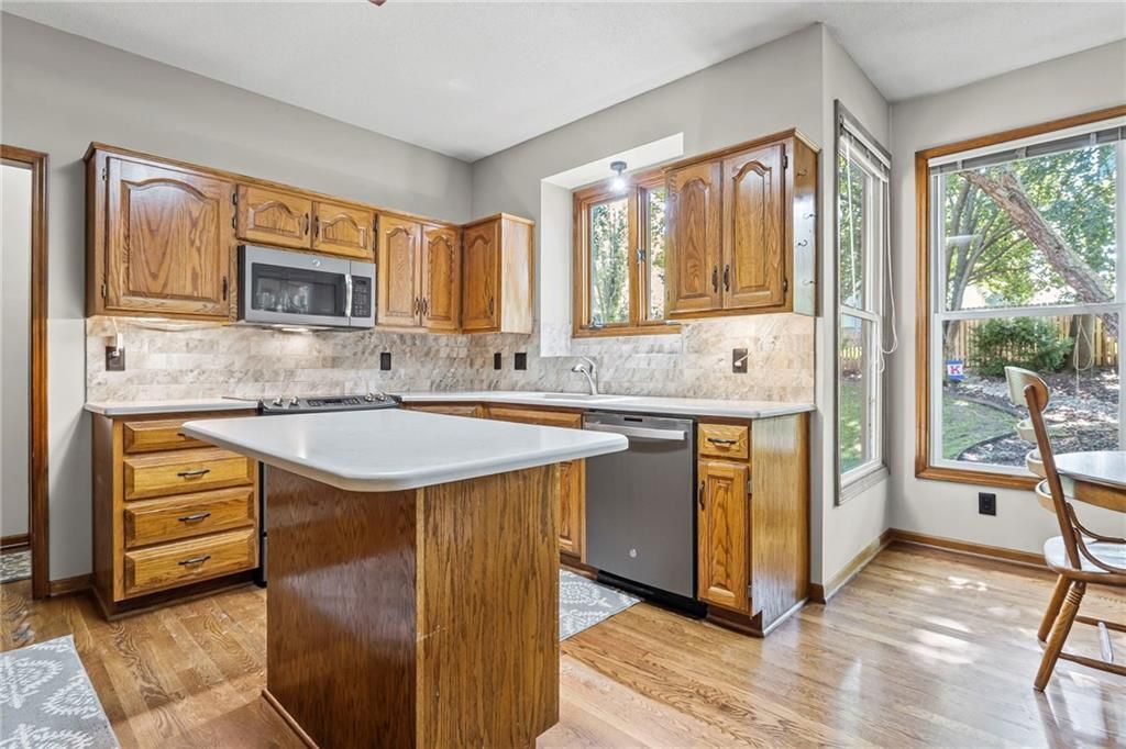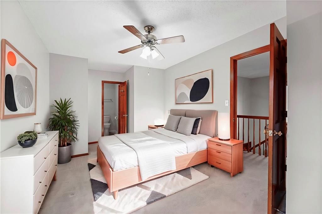 New Years just got a bit brighter with new carpet and it looks amazing! This Beautifully Maintained 2-Story in Creekside! is waiting for you. Tucked away on a quiet cul-de-sac in popular Creekside, this stunning 4-bedroom, 3.5-bath home offers an incredible blend of updates, space, and lifestyle. The private backyard is a showstopper with mature trees, a large covered deck, patio, sprinkler system, and new fencing - perfect for entertaining or relaxing outdoors. Inside, you'll love the updated hearth room and kitchen, featuring newer stainless appliances, quartz countertops, custom tile backsplash, and gorgeous hardwood floors. The main level also includes a formal dining room, spacious living room with fireplace, and a dedicated home office. The luxurious primary suite has hardwood flooring, while the remodeled bath boasts heated tile floors, a walk-in shower, and whirlpool tub. Every bedroom has access to a bathroom - one with a private en-suite, and two connected by a Jack & Jill. The finished basement adds even more living space with a large family/rec room, bonus room/home gym, and plenty of storage. This home is truly move-in ready with all the big-ticket updates already done: windows, New zoned HVAC, interior & exterior paint. Plus, Creekside offers a neighborhood pool, trails, and park - all just a short walk away. Located in top-rated Blue Valley School District