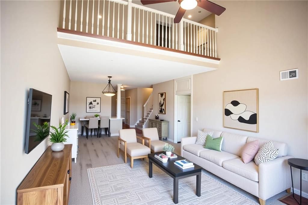 Welcome to this beautiful home in the highly sought-after Quincy Court of Lionsgate, a gated, maintenance-provided community with amazing neighbors and fantastic amenities! Step onto your south-facing deck, built in fall 2022 with durable composite materials designed to last a lifetime, and enjoy breathtaking open views of lush green space - it's like having your own vacation retreat just outside your living room! Inside, the main bedroom is conveniently located on the first floor, featuring a bathroom equipped with grab bars for added safety. Upstairs, you'll find two additional bedrooms and a full bathroom, providing ample space for family or guests. This home is move-in ready, with brand-new paint and carpet throughout (July 2024). The kitchen has been beautifully updated with a newly installed granite countertop, designer stainless steel sink, and stylish faucet, making it as functional as it is stunning. Recent upgrades include an A/C unit less than two years old, a new water heater, and a new washing machine (fall 2023). Plus, the huge unfinished basement offers endless possibilities for storage or future expansion. Located within walking distance to Lakewood Elementary and Middle Schools, this home also offers easy access to Highway 69 and Corbin Park's fantastic restaurants and shopping. No more cutting the lawn or shoveling snow! Those services and outside maintenance, including all roof repairs/replacement PLUS your Homeowners Insurance are included in the HOA Fee! With a neighborhood pool, gated security, and maintenance-provided living, this home offers it ALL!