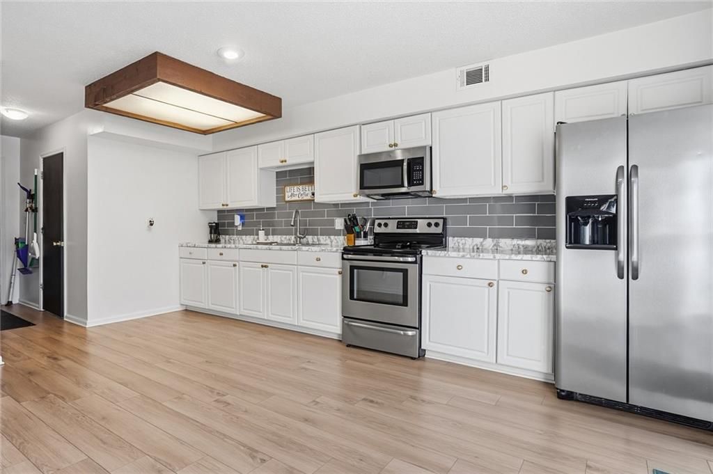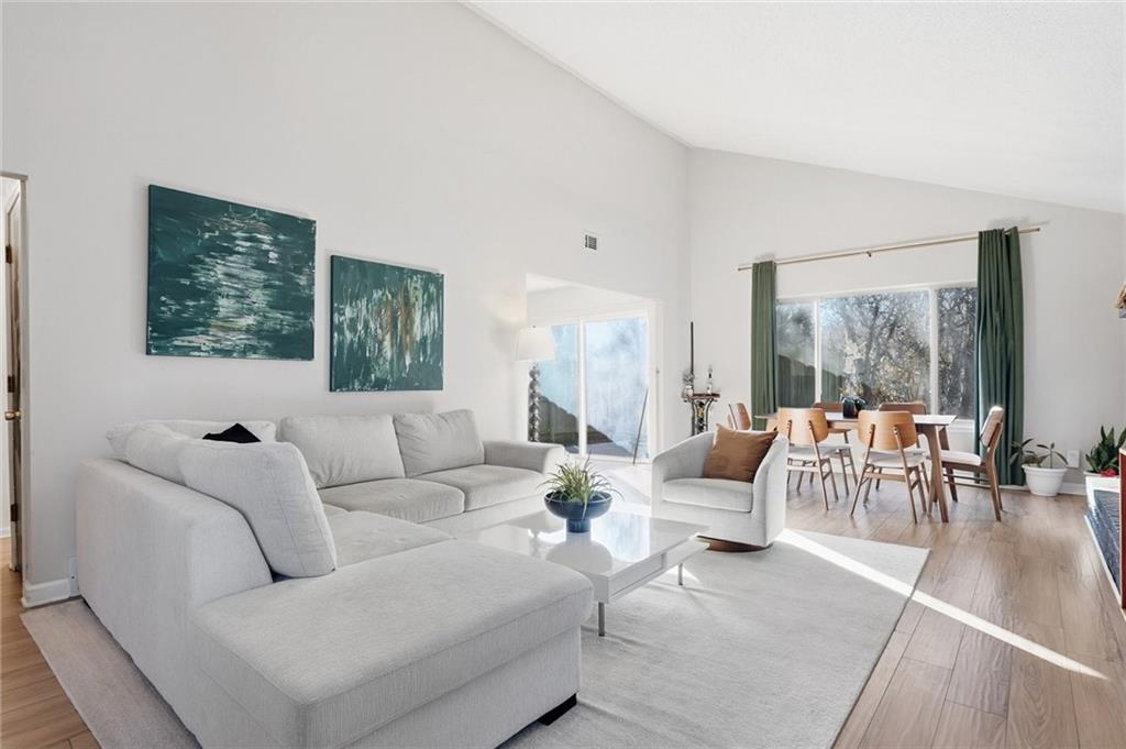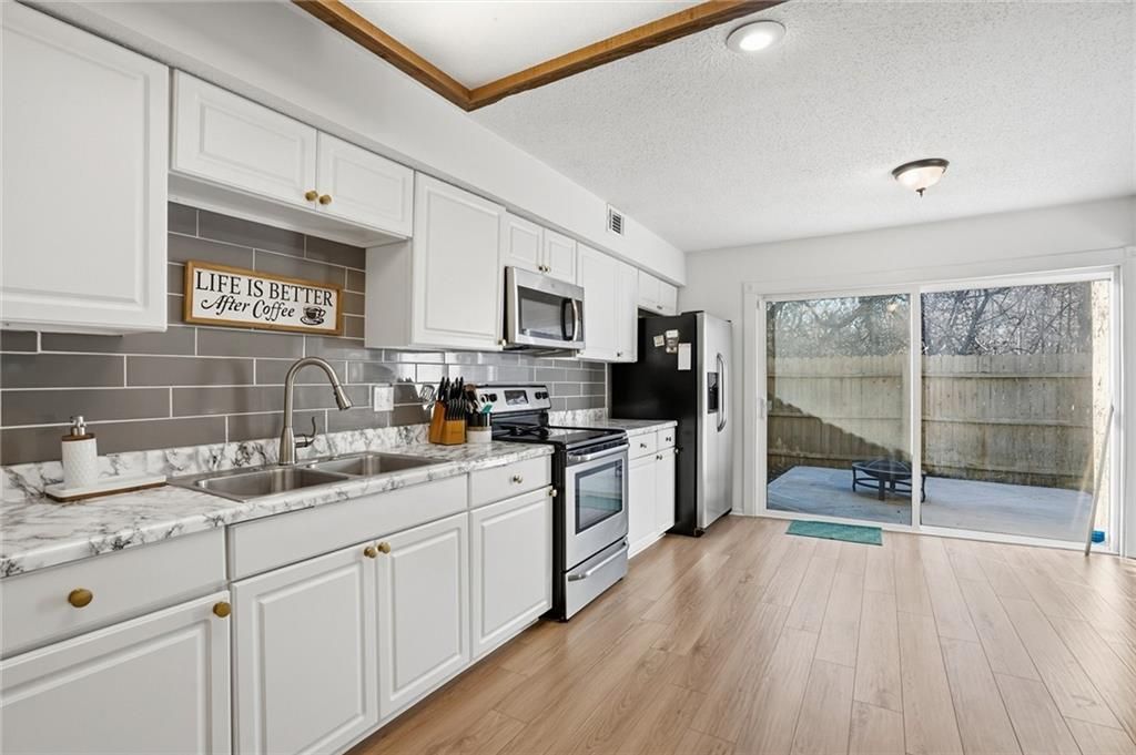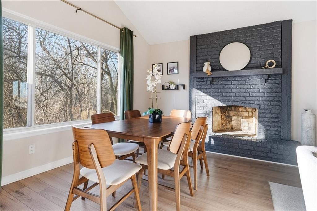 Amazing end-unit townhome backing to trees with NEW ROOF! Step inside to a vaulted great room filled with natural light, featuring a cozy fireplace and open flow into the dining area. New luxury vinyl plank flooring enhances the main living spaces, while the large, open kitchen offers excellent functionality and connection to the heart of the home. Enjoy outdoor living on the private, fenced patio, perfect for relaxing or entertaining. The unfinished basement provides abundant storage or the opportunity to finish for additional living space. Attached 2-car garage adds everyday convenience. Ideally located near I-70 and 78th Street, with quick access to shopping, dining, and KCKCC. HOA covers lawn care and snow removal, making for low-maintenance living. Don't miss this light-filled townhome in a quiet, convenient setting!