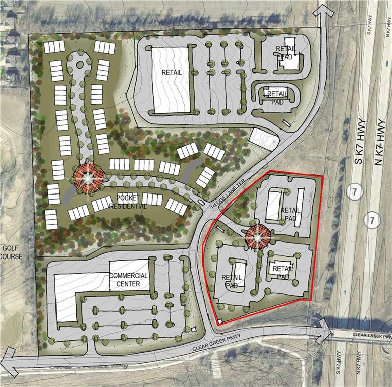 Amazing development opportunity. Excellent visibility from K-7 Highway. Frontage road already built through site, with water line. 5 acre tract planned for Commercial zoning (currently AG zoning). There is also 25 acres across Hedge Lane Terrace that is also available. Ready for your Commercial Project!